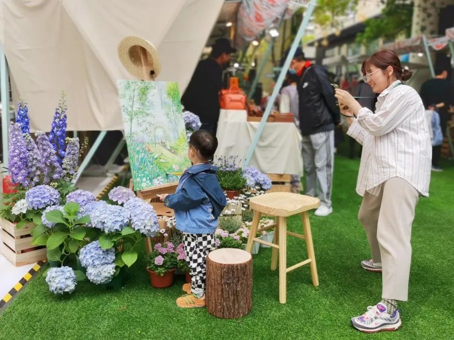 记者看到,市集入口处以亮色调为主色调,两边布置了层次分明的鲜花,带来了多感官的冲击。往里走,是载满鲜花的自行车、装入春色的画板、花团锦簇的秋千等三处文艺打卡处,春日的动与静有机结合,市民可走进如油画般的景致中拍照留念。