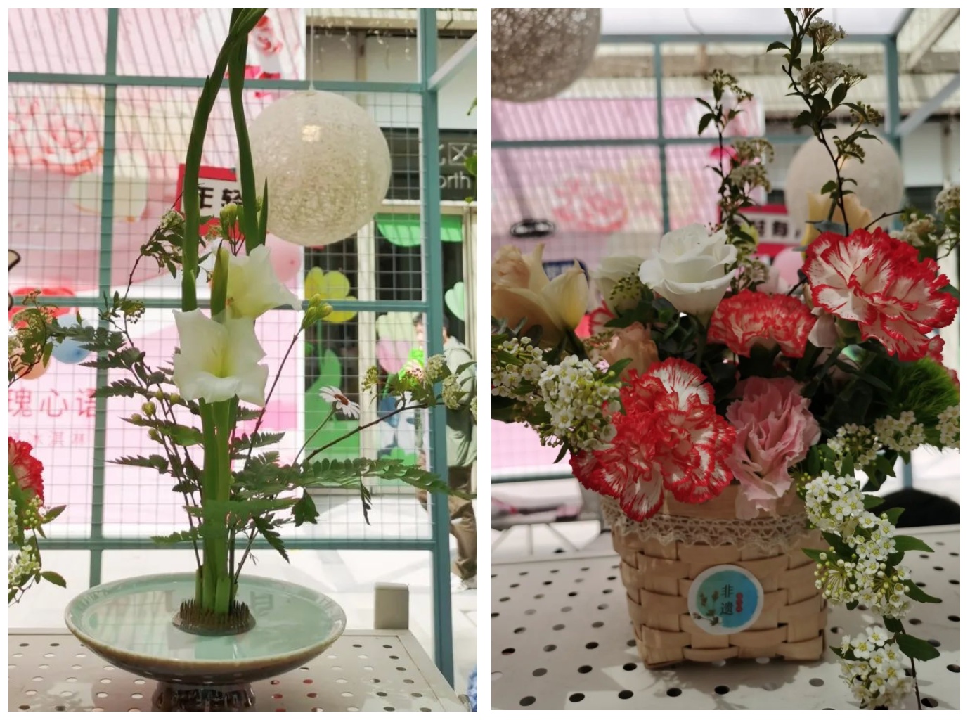 现场还有两款特别设计的鲜花插花作品,由已毕业的学长潘沈涵创作。一款为表现自然姿态美感的中国传统插花——碗花,使用中式插花用具“剑山”来固定花材,色彩清淡,线条优美;另一款则是呈现油画厚重质感的西式花篮,契合本次市集主题,花材色彩丰富,层次分明。作为第44届世界技能大赛花艺项目冠军,潘沈涵是不少学弟学妹们的榜样。他表示,希望通过市集,让更多人了解已有3000年历史底蕴的中国传统插花。