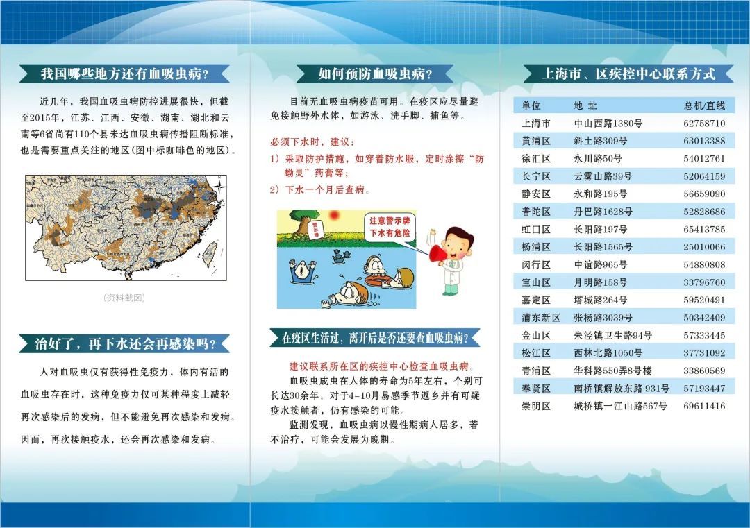 请勿到有钉螺孳生的河边、田边及沟渠钓鱼、游泳及戏水。如果不小心接触,在1个月内出现发热、腹泻等症状,应引起高度警惕,要及时到正规医疗机构接受检查,必要时进行早期治疗。