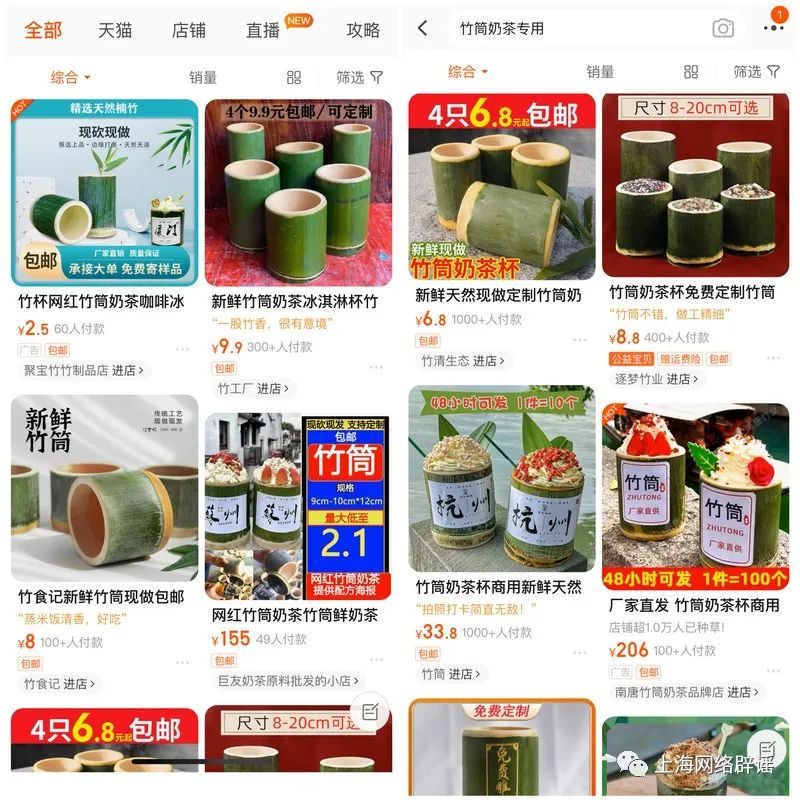 虽然商家不说,但竹筒奶茶的包装竹筒杯来源并不是秘密。眼下,在电商平台就有成千上百家卖竹筒杯的商家,一些卖得好的店铺单月订单量过万,很多奶茶经营者是从这些店铺进货。