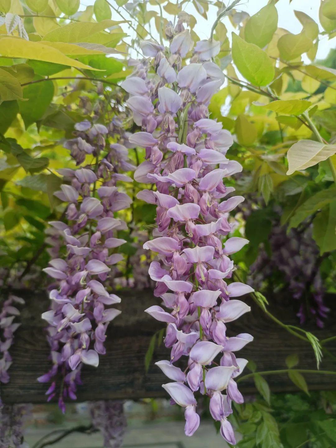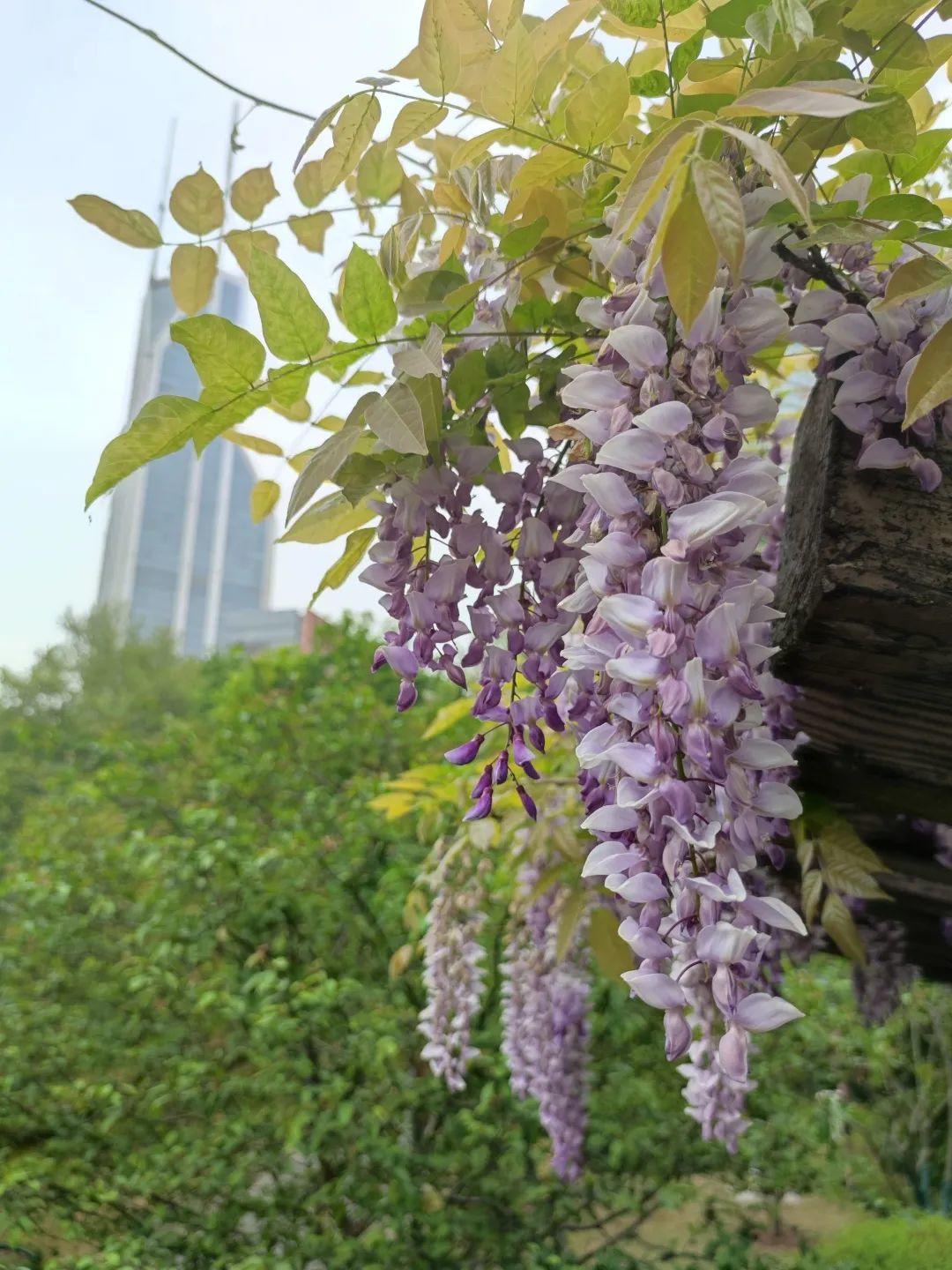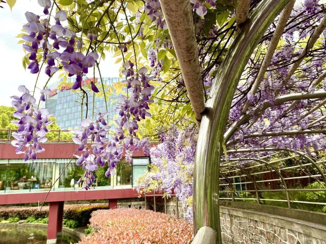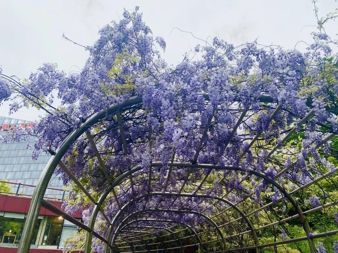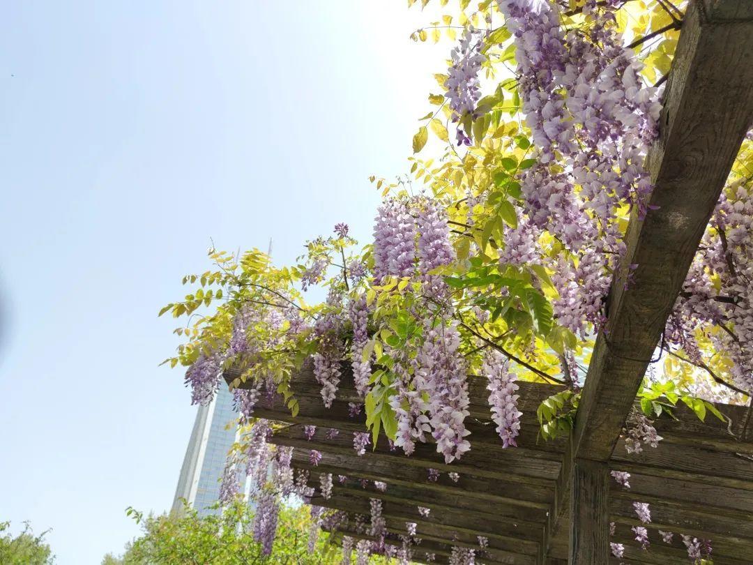 芳香的四月,除了牡丹、绣球、杜鹃花以外,还有迷人的紫藤花格外养眼。近日,由金外滩集团下属人民公园公司养护管理的人民公园与古城公园内的紫藤花已陆续进入盛花期。整个花架渐渐呈现出了春日的浪漫与梦幻,串串花穗垂吊下来,幽香阵阵,引得游人驻足赏花拍照。