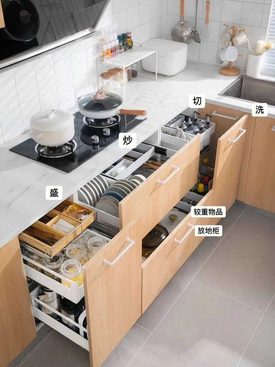 厨房里最顺畅的动线就是:洗—切—炒—盛,所以可以根据备餐动线,来规划布置各个区域所需物品。