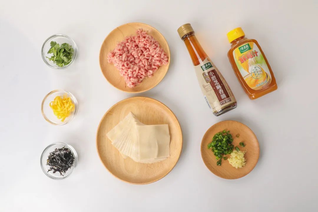 1.先将葱花、姜末、鲜鸡汁调味料5克、小磨芝麻香油5克加入肉糜中搅拌上劲备用。