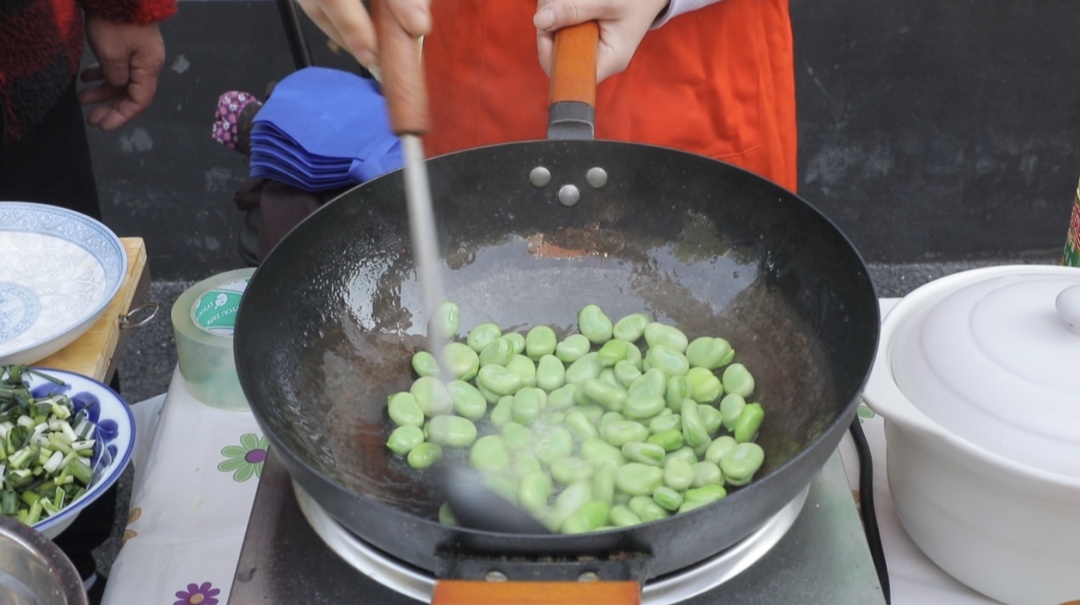 第二位选手莎莎则烧了最简单的“葱油蚕豆”,她表示,烧这道菜要快,火要旺,否则蚕豆就会变老。田螺是来自水中的春鲜,参赛选手之一烧的是田螺塞肉,先将田螺放进油锅煎至凝固,再加上作料炒制,味道十分鲜美。