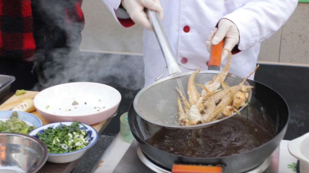 另一位选手是做爆鱼生意的,他炸烤子鱼时用的是大油和旺火。只见他细心地把鱼一条条放入油中,几分钟鱼身就出现了金黄色。油炸烤子鱼,吃的是鱼肚里的一包鱼籽,蛋白质含量高,营养价值高,油炸后蘸上料汁,松松脆脆的感觉不要太好!最后一组选手烧的是江南名菜“塘鲤鱼烧豆腐”,这道菜曾因为塘鲤鱼的消失而失传,如今随着塘鲤鱼的复兴而再次流传开来。这道菜的汤色洁白,鱼的口感细嫩、滑爽、鲜美,成为了众多市民的心头好。