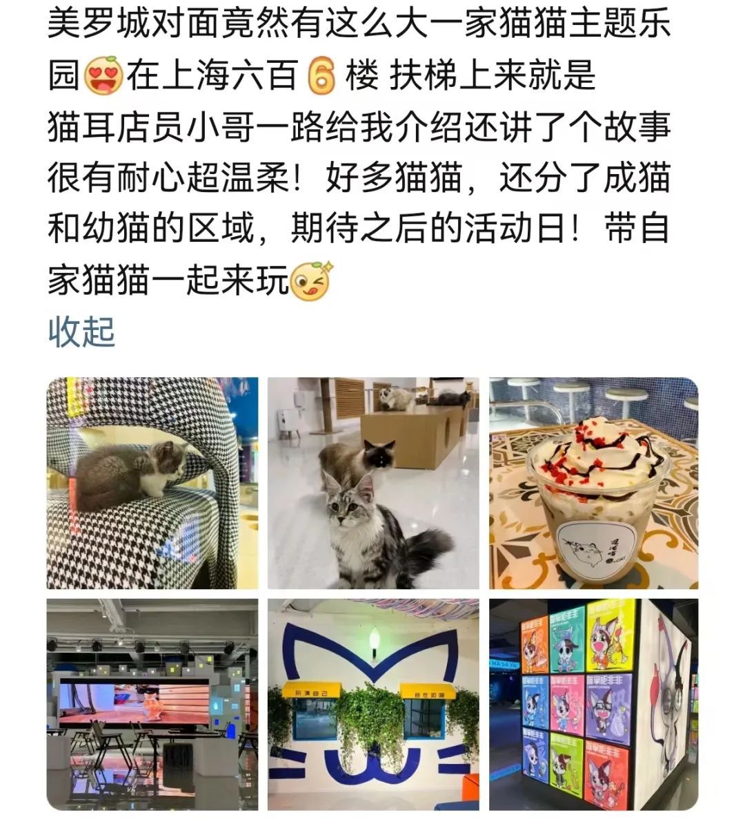 根据介绍,“喵们乐园”定位为沉浸式人猫互娱一站式服务乐园,希望打造社交新平台,为年轻人创造更多可以展现才华、互动交流的城市心灵露营地和开心乐园。