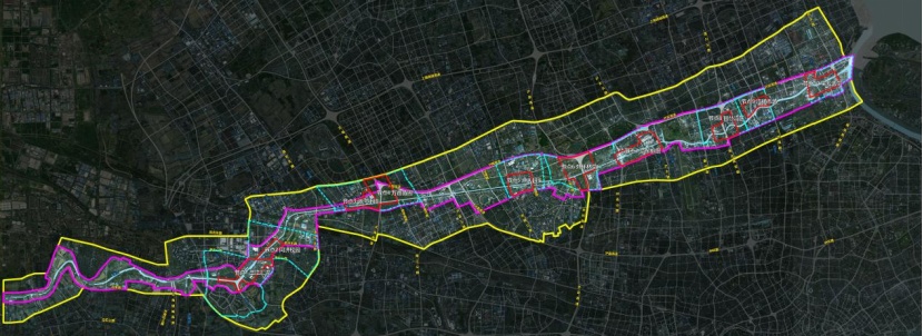 本次国际方案征集包括总体用地布局、详细设计范围、节点设计三个层次规划范围,总体研究范围为4公里蓝绿交织区,西至沪苏省界、东至黄浦江,全长约46.7公里,两岸腹地各约2公里,总面积约170平方公里。详细设计范围为1公里滨水区空间,两岸腹地各约500米,总面积约53平方公里。其中,200米范围为亲水区空间。同时,对三江汇流、同济校园、运河小镇、万亩苗圃、渔人码头、外环林带、蕰东枢纽、智慧湾区、江杨市场、吴淞秀带等十大特色节点开展深化设计。