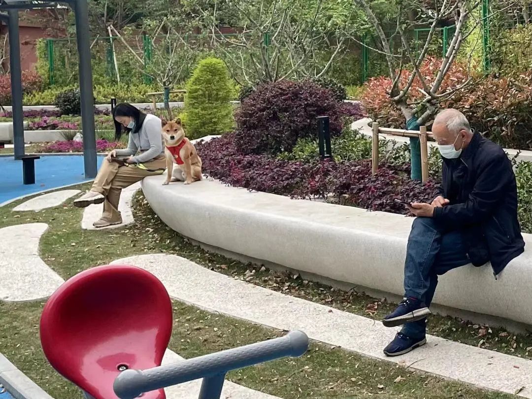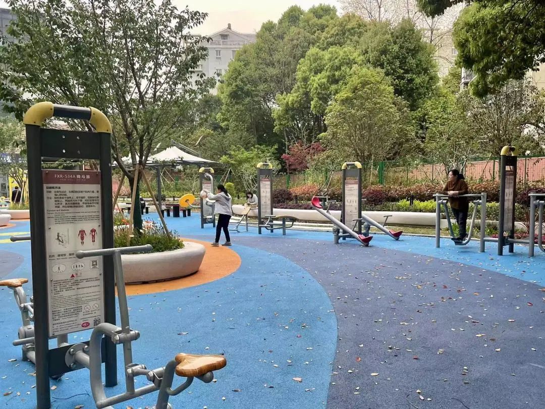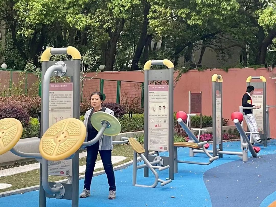 “器材也多了不少啊,除了有适合老年人的基础设施,还有小朋友喜欢的摇摇椅、跷跷板和秋千。”
