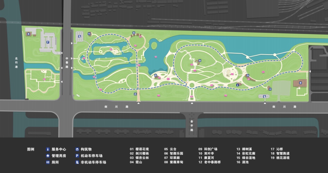 公园不设围墙,以染井吉野樱为主题的“剑川樱画”,花繁艳丽,如云似霞,以大香樟和大朴树为点缀,天然地具有防护和景观功能,加上中春路西侧以桃花为主题的“桃花源境”,二者在剑川路上绵延1公里多,开花时节,将成为壮观的风景。