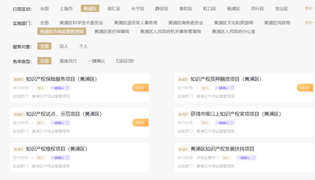 “免申即享”也是优化营商环境的一项重要举措。《黄浦区知识产权发展扶持办法》中知识产权质押融资、知识产权保险服务,知识产权试点、示范,市级以上奖项,维权项目等也依托一网通办上线“免申即享”功能。通过前期大数据中心共享抓取,确定了拟享受政策的企业名单和资助金额,将“免申即享”链接直接通过“一网通办”企业邮箱推送给企业,企业只需“一键确认”申报内容和银行账户即可坐等扶持资金入账,免去了往年企业需要线上线下提交各类证明文件、营业执照等材料的繁杂流程,让企业真正当上了“甩手掌柜”,实现从“人找政策”到“政策找人”的蜕变。
