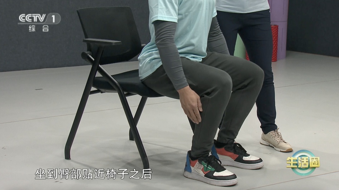 2.屈髋,臀部后移,找到椅子的位置,同时开始屈膝慢慢坐下,坐到臀部贴近椅子之后,躯干和大腿保持90度;