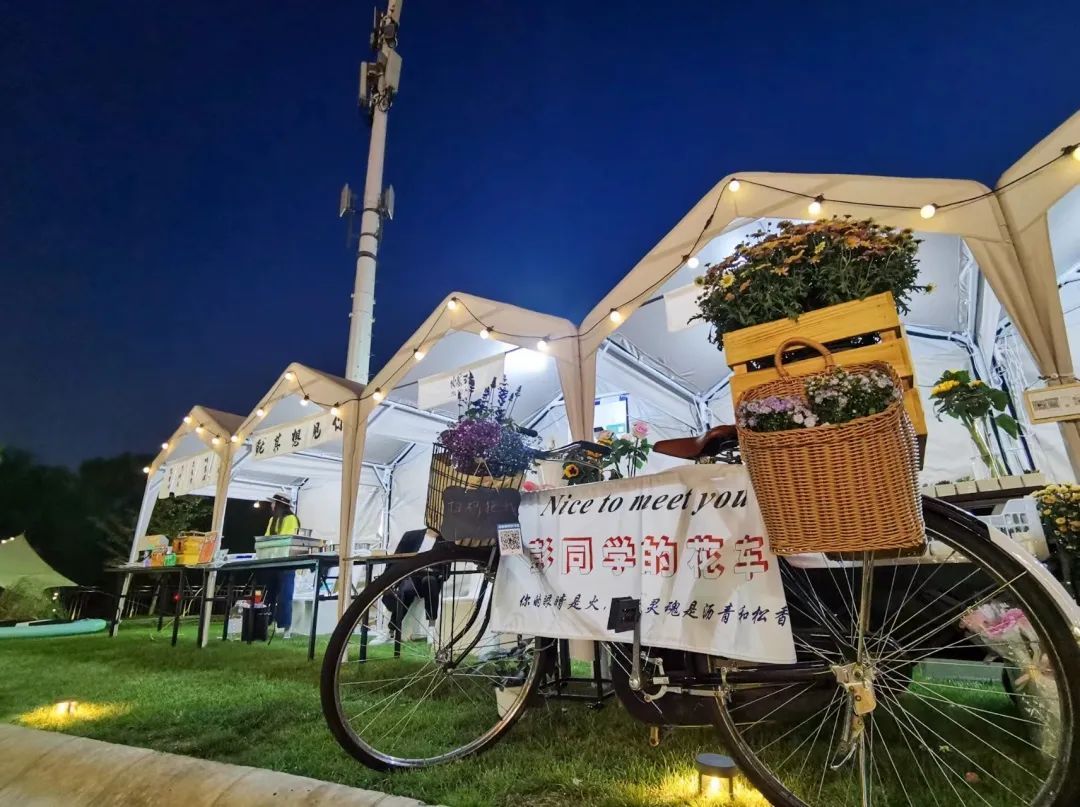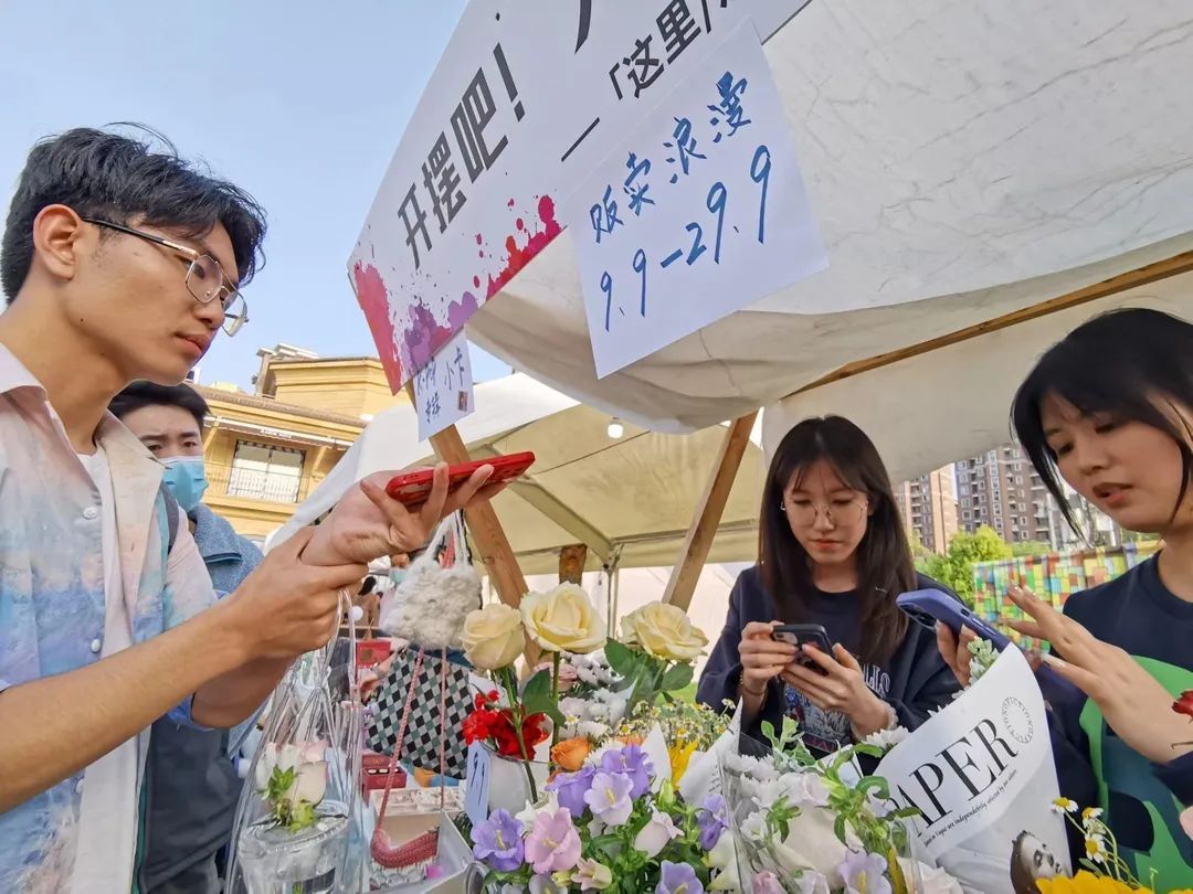 五花八门的摊位中也有大学生们的一席之地。一句“开摆吧!大学生”亮出了青年人向上求真的态度。上海工程技术大学四年级学生刘亚楠的鲜花摊位专门“贩卖”浪漫与快乐。15元一份的水杯鲜花为路人掬得芬芳一路。“生活不止眼前的忙碌和奔走,偶尔也需要停下来用心感受。”刘亚楠说。