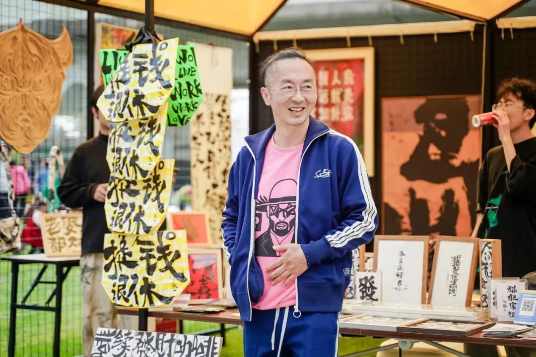 “一生二人三餐四季”“人间奇味是清欢”……集市入口处的艺术文创衍生品展示空间内,字体奇崛跳脱的书法作品便是一道道特立独行的风景,牛仔外套、文化衫、帆布包、手账本等无一不是“会说话的艺术”。留着长发的摊主是大名鼎鼎的南门书法创始人朱敬一先生。观者不言,他就安静地坐着不去打扰,若有人驻足询问,才会起身温和地与之对话。