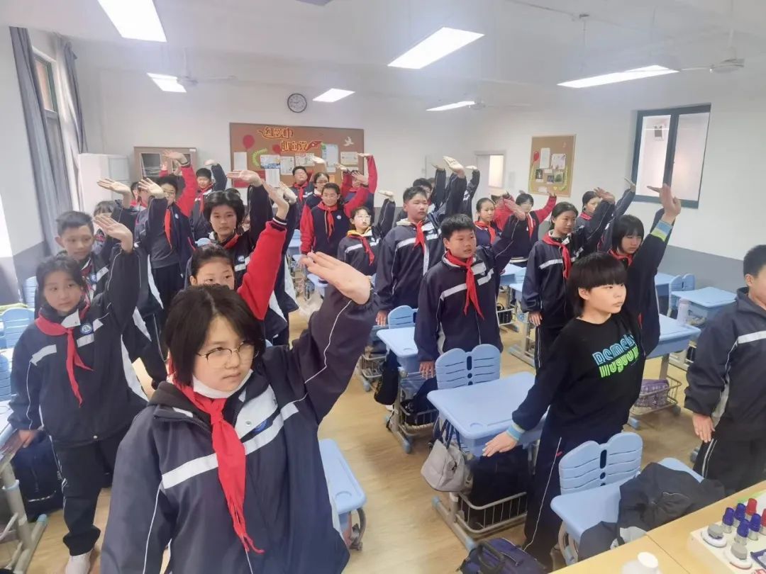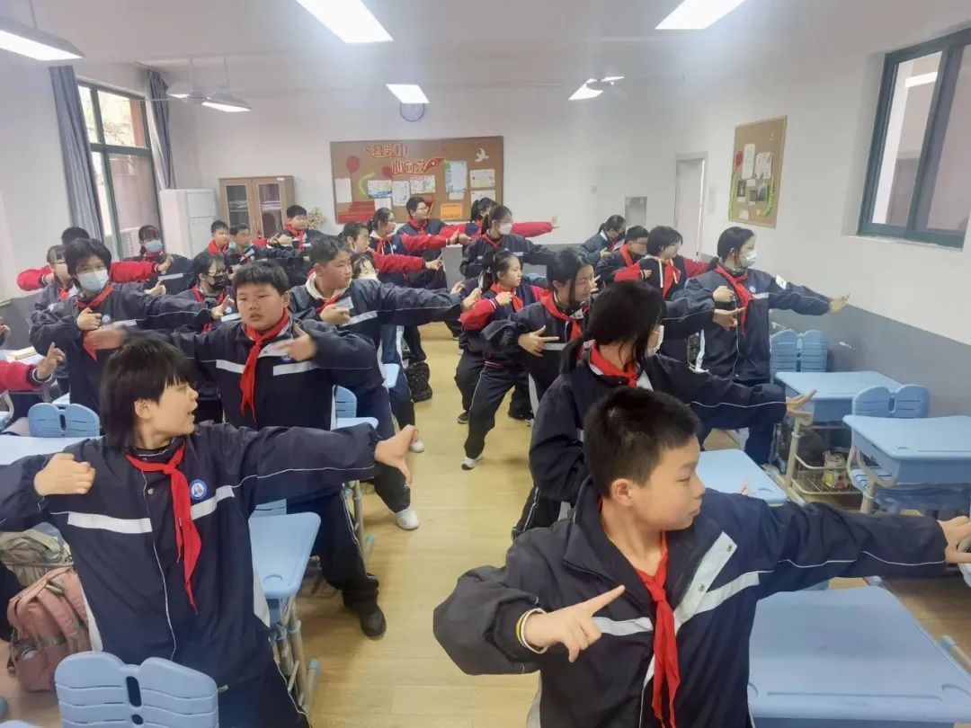 在虹教附中,每到上午课间操时间,同学们就会在教室里打上一套5分钟版的简易八段锦。舒缓的音乐,整齐划一的动作,大家精神焕发,一招一式尽显风采。