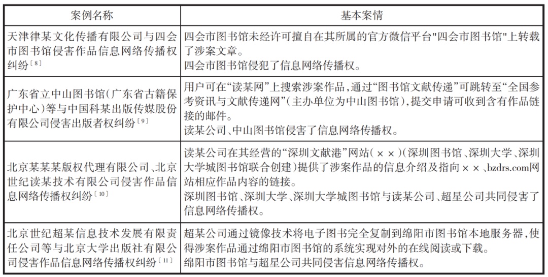 除了与发行权产生混淆之外,信息网络传播权与复制权的厘定也是至关重要的。笔者在北大法宝中进行检索,高级检索下筛选有公共图书馆作为当事人的著作权侵权纠纷,作了如下整理(类似案情不再重复):