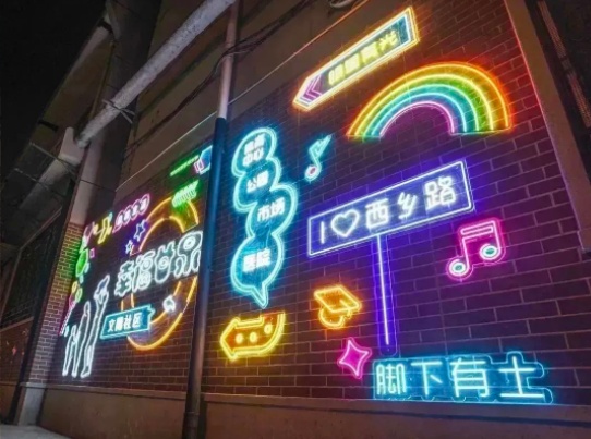 而到了晚上,围墙上的霓虹灯亮起,又是另一道风景线……