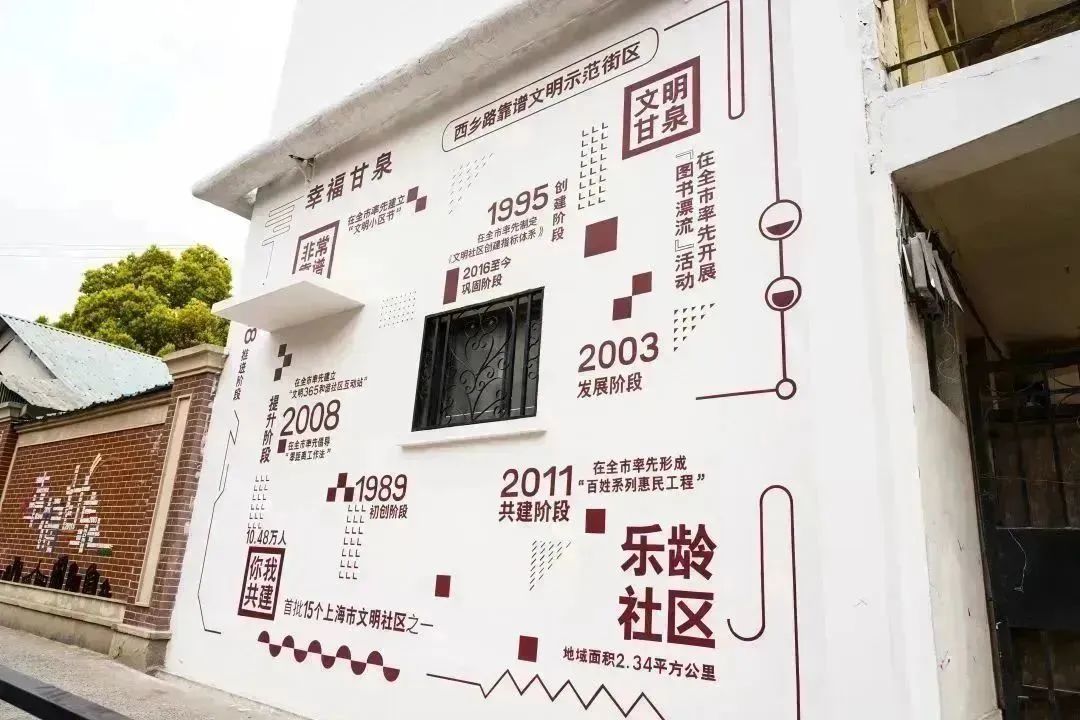 以甘泉精神文明发展为主题,围墙上的甘泉精神文明发展时间轴串联起过去、现在、将来,使居民在街区漫步时便能感受到“有记忆的街区、可阅读的建筑、有温度的城市”。