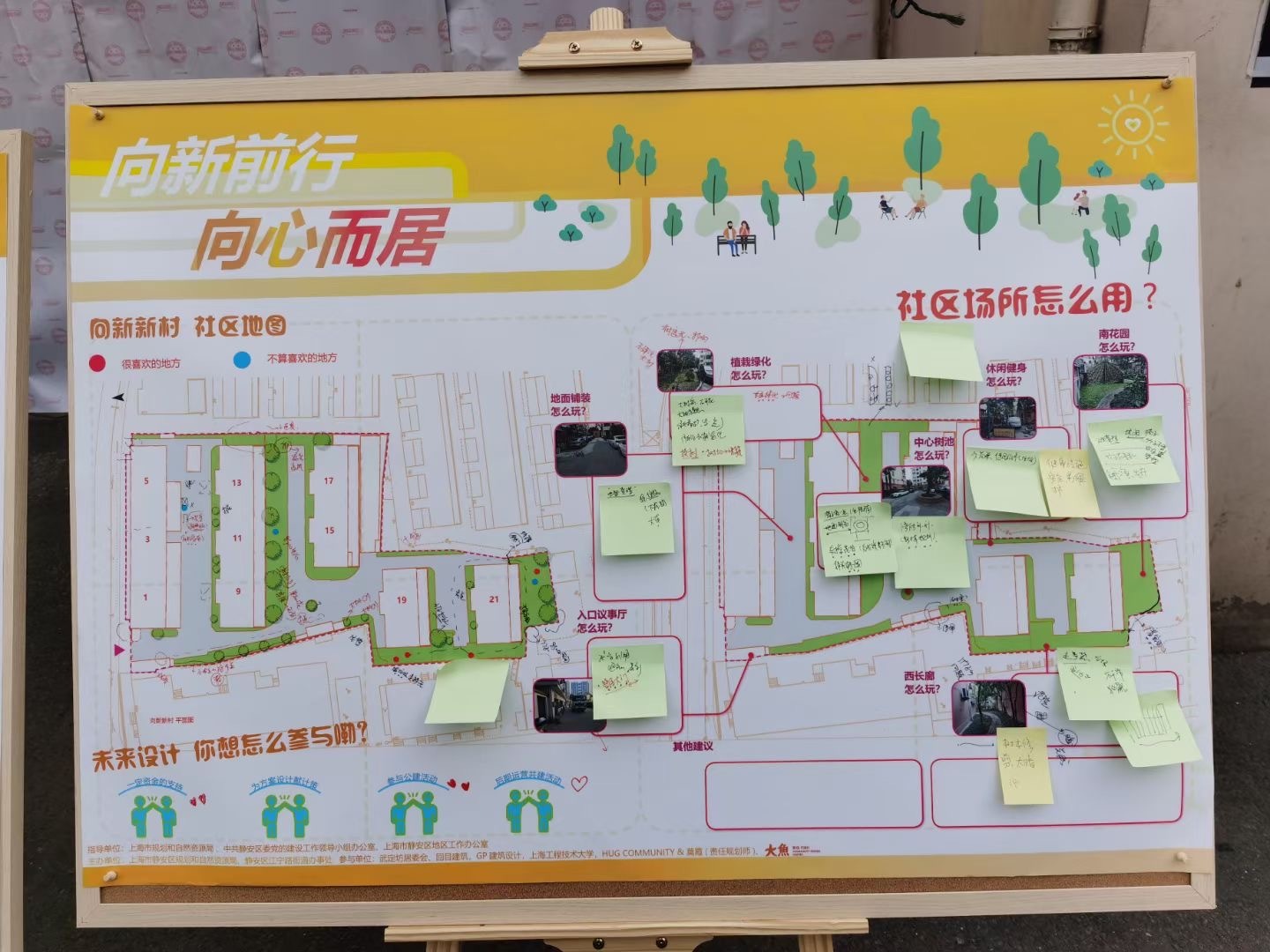 未来向新畅想留言板上,居民张先生提到,希望未来向新社区更加关注老人,增加供老人跳舞、举办活动的室内场地,同时增加丰富多样的社区活动,为老人带来精神慰藉。增加室内活动场地,同时也是本次参与活动的其他10多位居民的共同诉求。社区规划师团队认为,这也是老龄化加剧的城市背景下,社区规划将要重点关注的方面。