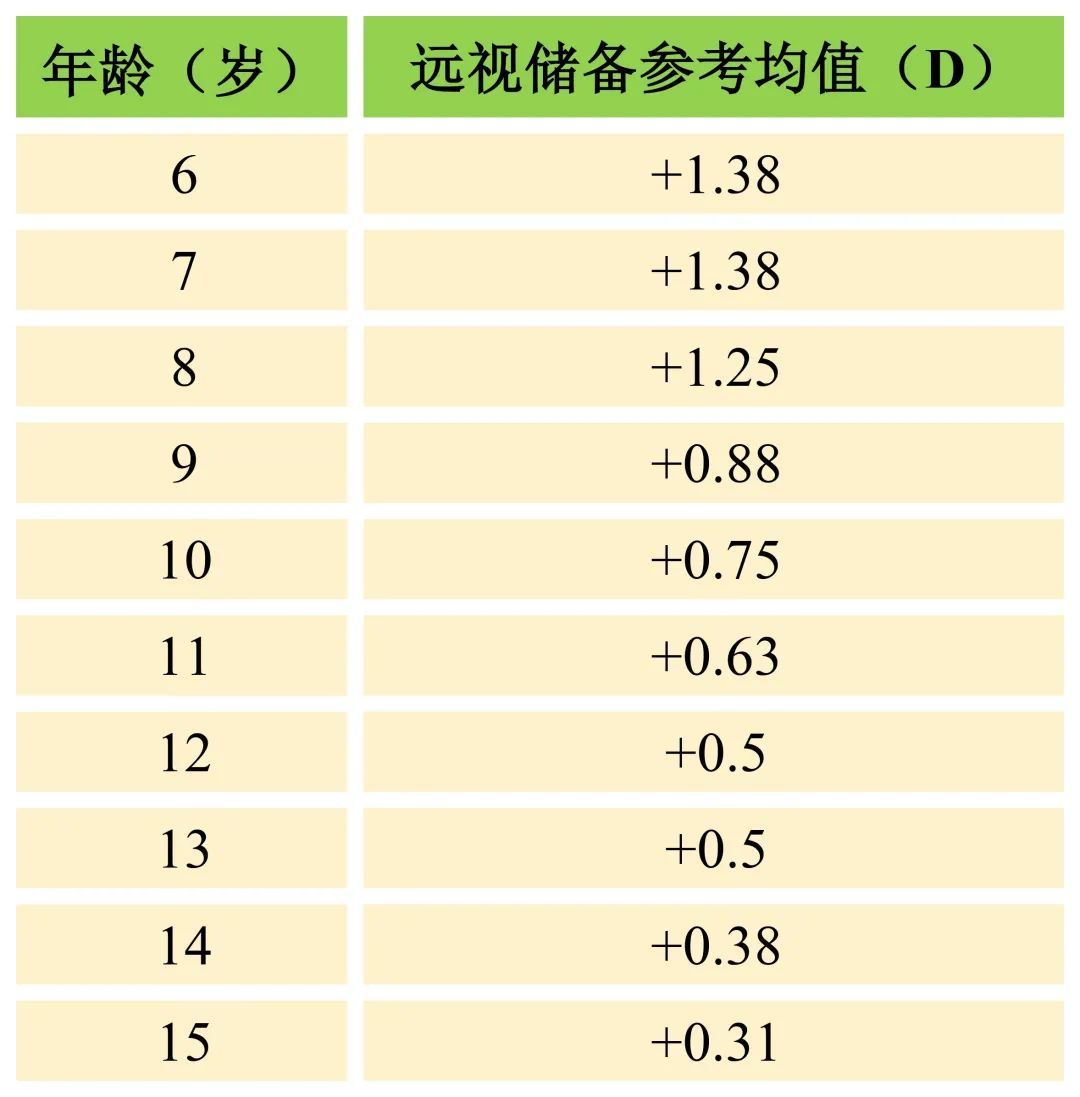 准确测量远视储备应在充分散瞳的基础上进行验光。以屈光度(D)表示,6岁儿童的远视储备平均为1.38D,随后每年以平均0.12D的速度减少,12岁时进入正视眼的屈光度范围(0.5D)。6-15岁的你,要想知道自己有没有透支“视力财富”,请查看下表(6-15岁儿童远视储备正常参考值):