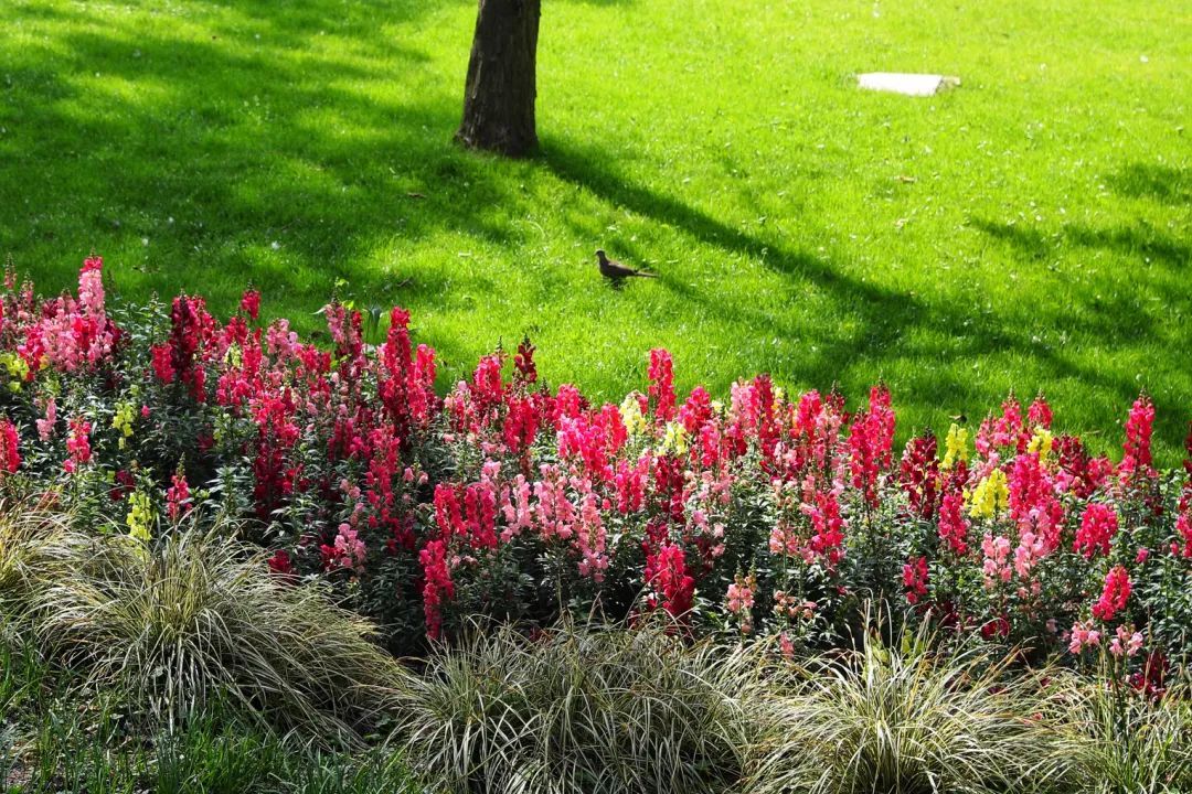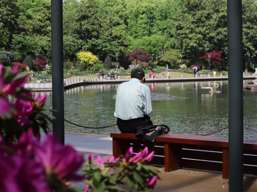色彩斑斓的花朵盛放在一片草地和树木的浓荫之中,波光粼粼的水面增添了一丝春日的梦幻。黑天鹅闲适地悠游,喷泉的水汽渲染出一片彩虹,这片就在商圈旁边的公园散发着无穷魅力。