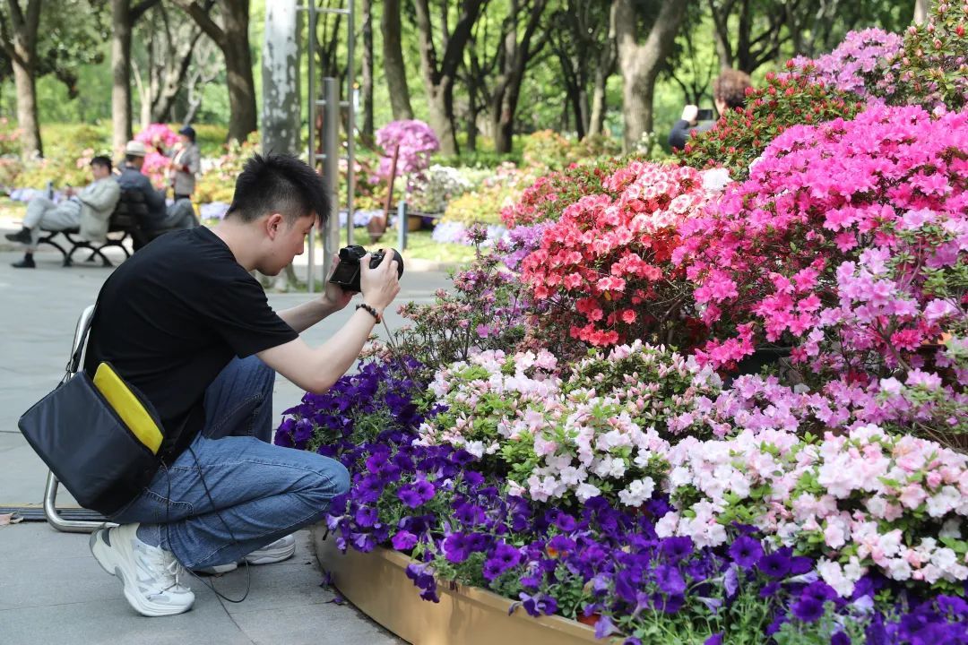 杜鹃花溪尤其引人注意。沿着弯弯曲曲的水道,白色、粉色、玫红、大红的杜鹃一簇簇盛开,引来许多市民欣赏。四海繁花的造景仍在搭建之中,旁边区域已经布置好了科普展示牌,让大家在赏花之余,也能了解生物多样性的重要。
