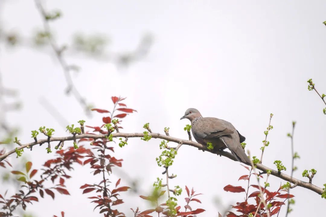 “咕咕咕!”是谁在树枝上欢快地唱歌?原来是不远处有一只珠颈斑鸠。我兴奋地举起望远镜,仔细观察起来。茂密的树叶间有一个小脑袋,眼珠子滴溜圆,正目不转睛地看着我。我发现它全身的羽毛是棕色的,脚是红色的,最特别的是它的脖子,脖子两边是黑色的羽毛,其中密布白色斑点,像许许多多的“珍珠”散落在它的颈部。老师说,这就是“珠颈斑鸠”名字的由来。