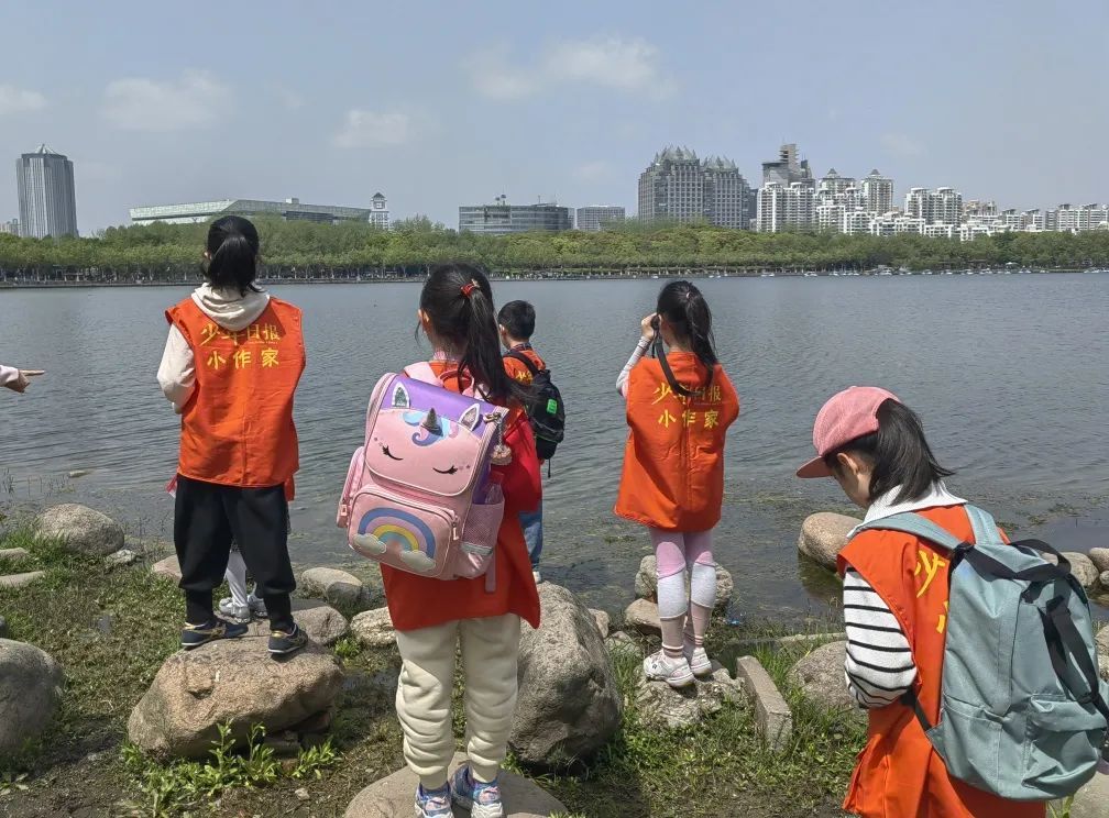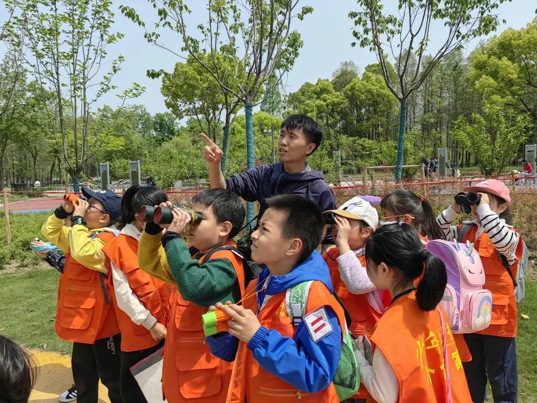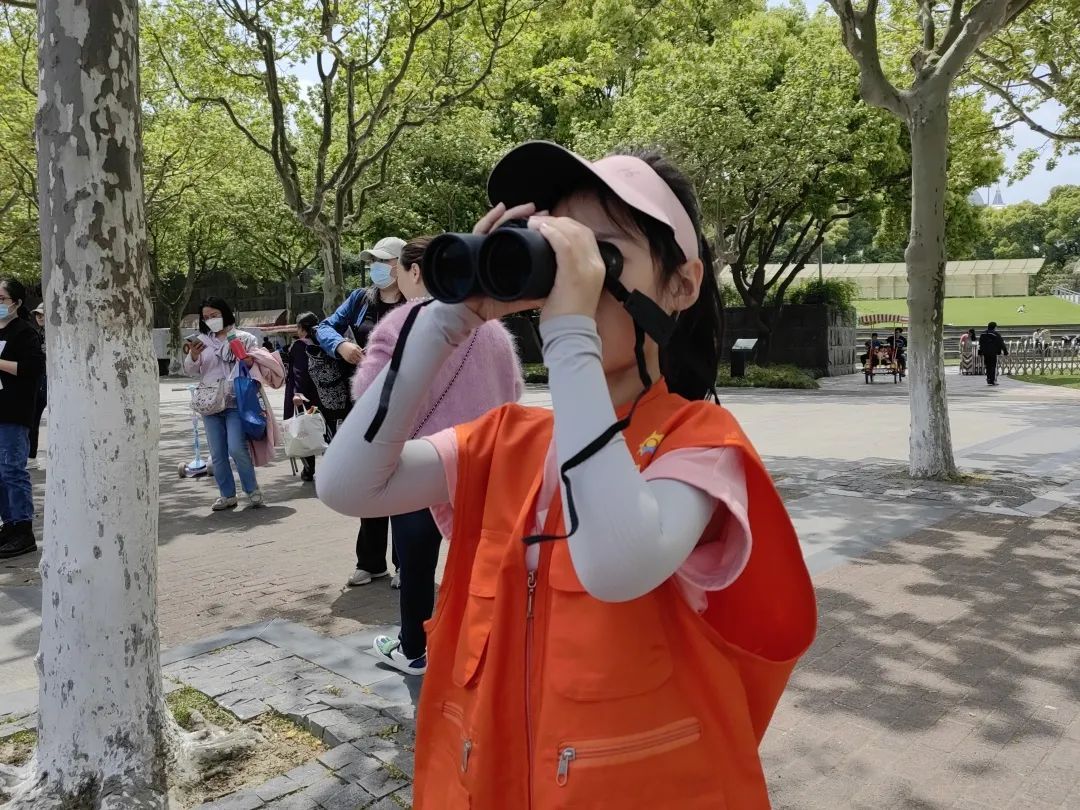 踏着春光,走在水域边、树荫下、密林里,小作家们在上海市林业总站野生动植物保护科郑运祥老师的指导下,拿起望远镜和相机,通过聆听鸟叫、观察河面与四周等方式发现了乌鸫、黑水鸡、远东山雀、珠颈斑鸠等近十种鸟类。
