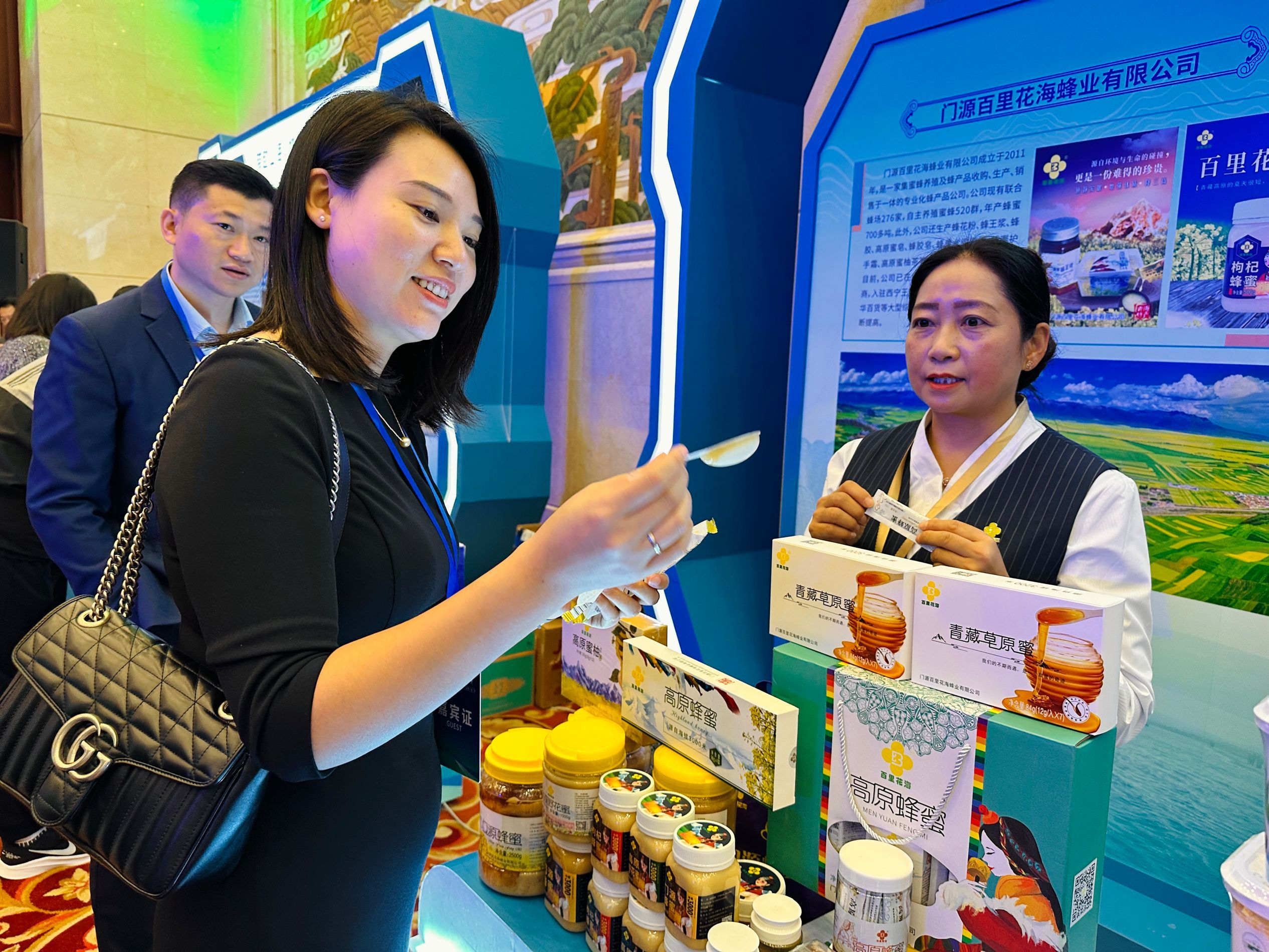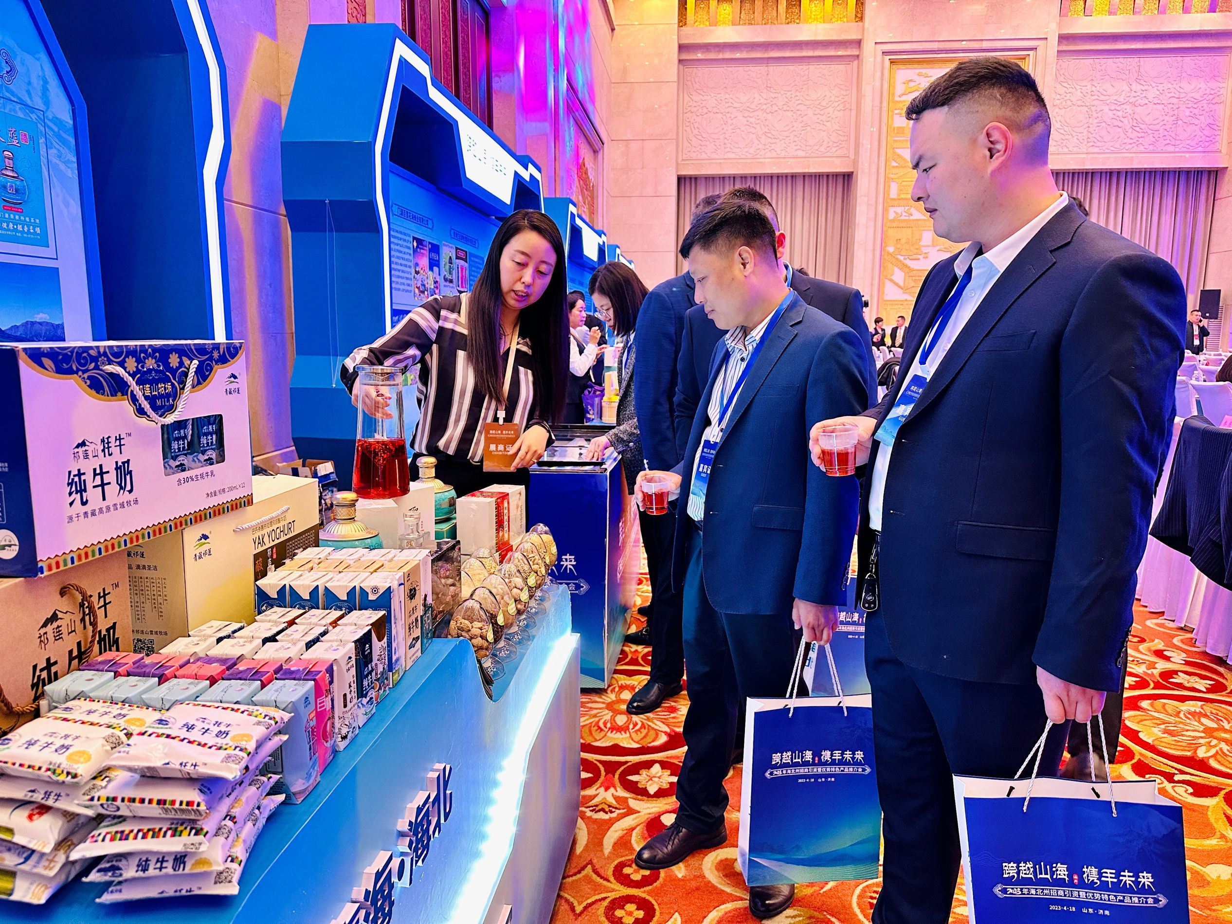 本次推介会充分发挥山东对口支援海北平台作用,采取项目推介、洽谈签约、农牧产品展示等形式,宣传展示了海北州的壮美旅游风光、特色农牧产品,介绍了海北州产业基础、发展优势和营商环境,并设置了优势特色产品展销区,展示了来自海北州的绿色有机牛羊肉、青稞产品、牛奶制品、天然蜂蜜、健康茶饮、掐丝唐卡艺术品等30余种优势特色产品。