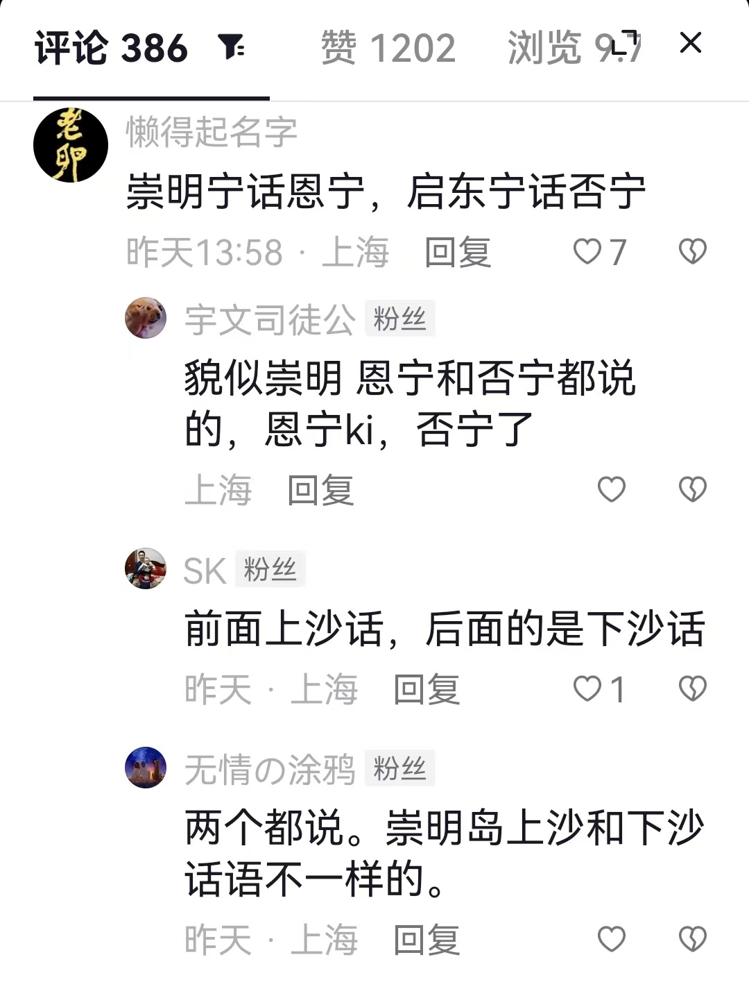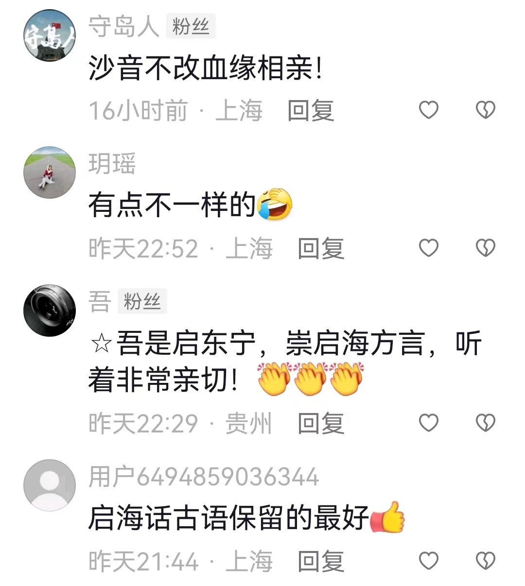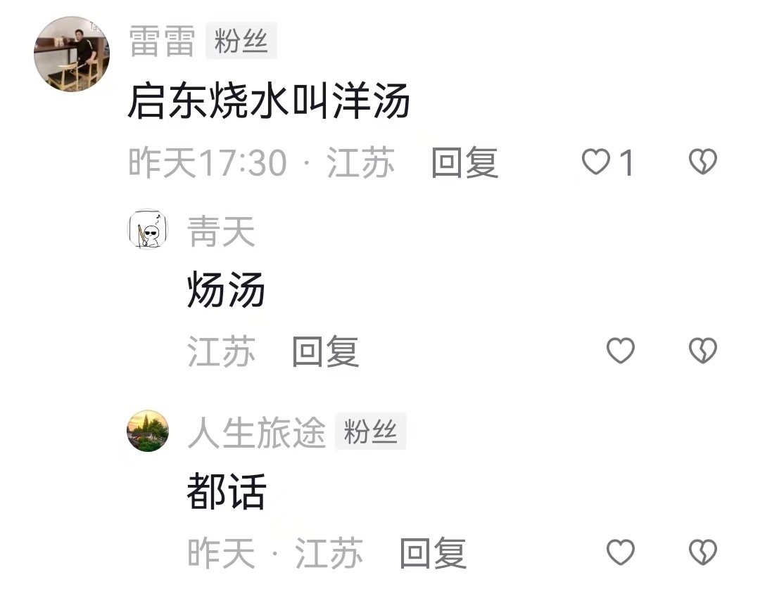 “崇明人话着力”“启东人话害厉”“海门人话交关”……这条短视频的评论区俨然就是属于崇启海三地网友的线上“聊天室”。大家对谈着三地方言、民俗的同异,述说着悠久、多彩的历史和文化。