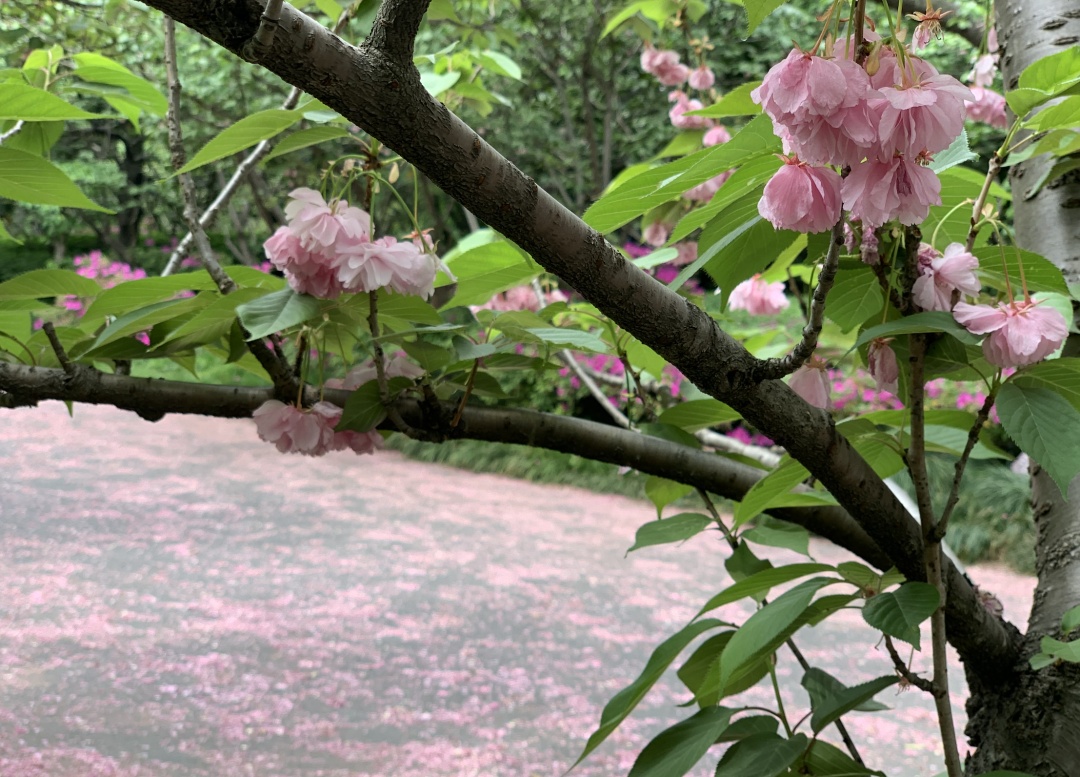 受近几日大风影响,晚樱枝头花朵存量较之前有所减少,落樱量较大,想观赏落樱的市民游客可在天气晴好时前来打卡。