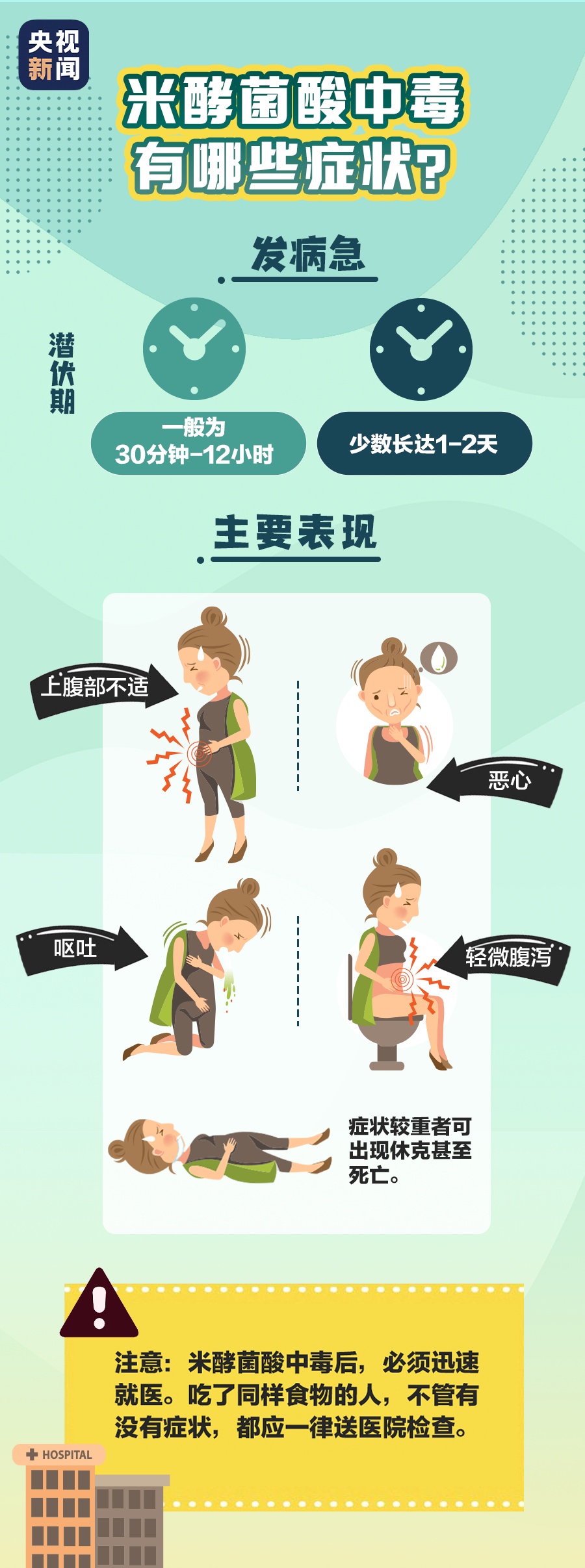 中毒者有急性胃肠炎症状,临床表现为进食后2至24小时出现上腹不适、恶心、呕吐,重者呈咖啡色样物,轻微腹泻、头晕、全身无力等。严重者可出现呕血、血尿、少尿、皮下出血、黄疸、肝脾肿大、意识不清、烦躁不安、四肢抽搐甚至中毒性休克等而死亡。