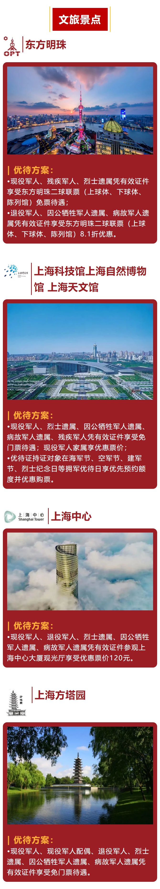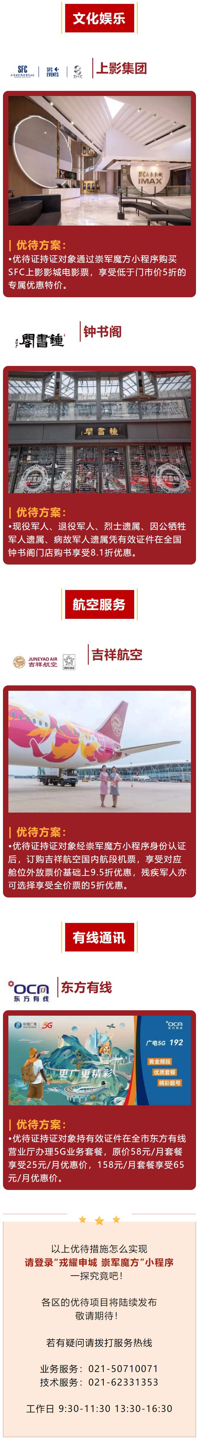 “戎耀申城 崇军魔方”上海市社会化拥军首批优待证专属优惠项目“戎”耀呈现。文旅景点、酒店住宿、生活购物、文化娱乐、航空服务、有线通讯等六个方面优待措施面向全国优待证持证对象开放!