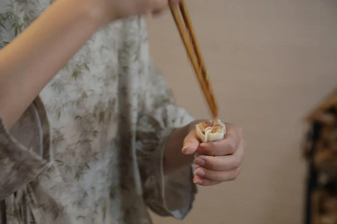 在面皮中心放上适量肉馅后,用左手将面皮向上方中心合拢,右手用筷子不断压实肉馅,在即将合拢时抽出筷子。最后在烧麦的颈部捏一下,就能做出烧麦的“小蛮腰”。