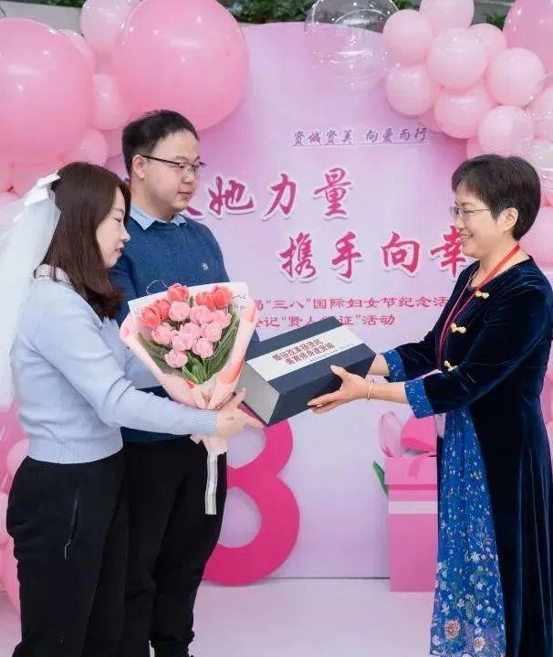 特邀颁证师、上海市三八红旗手王智华,为贤城新人颁发结婚证,激发广大女性在以中国式现代化全面推进中华民族伟大复兴的新征程上争做伟大事业的建设者、文明风尚的倡导者、敢于追梦的奋斗者。