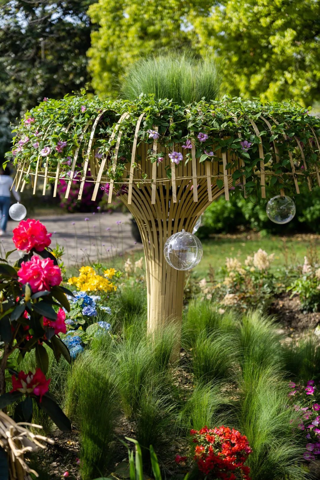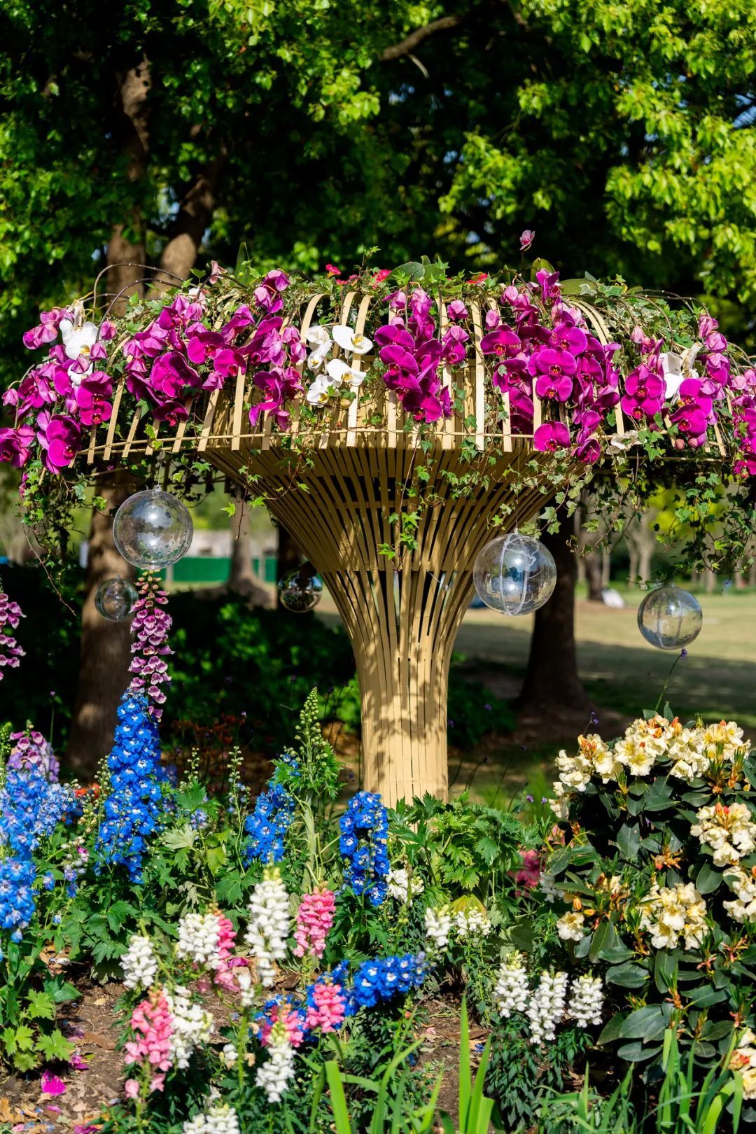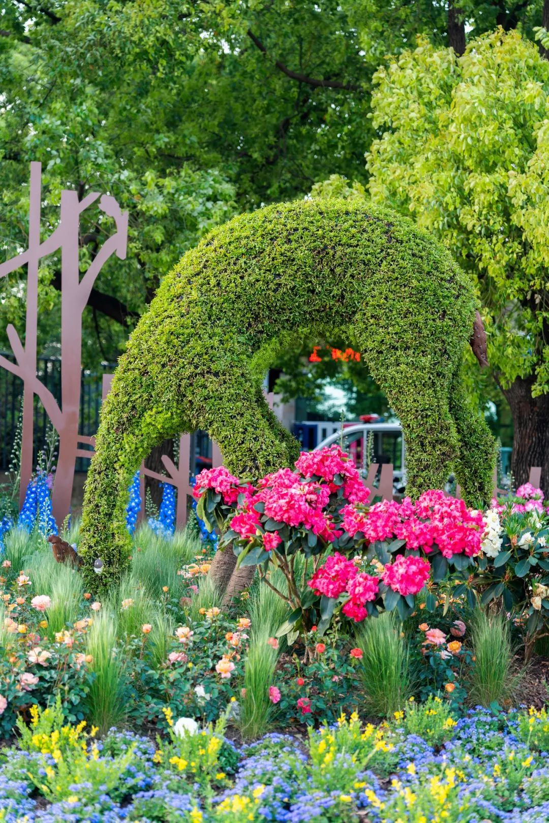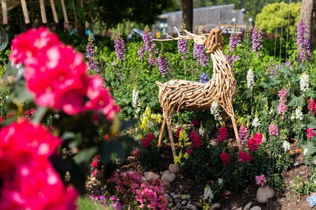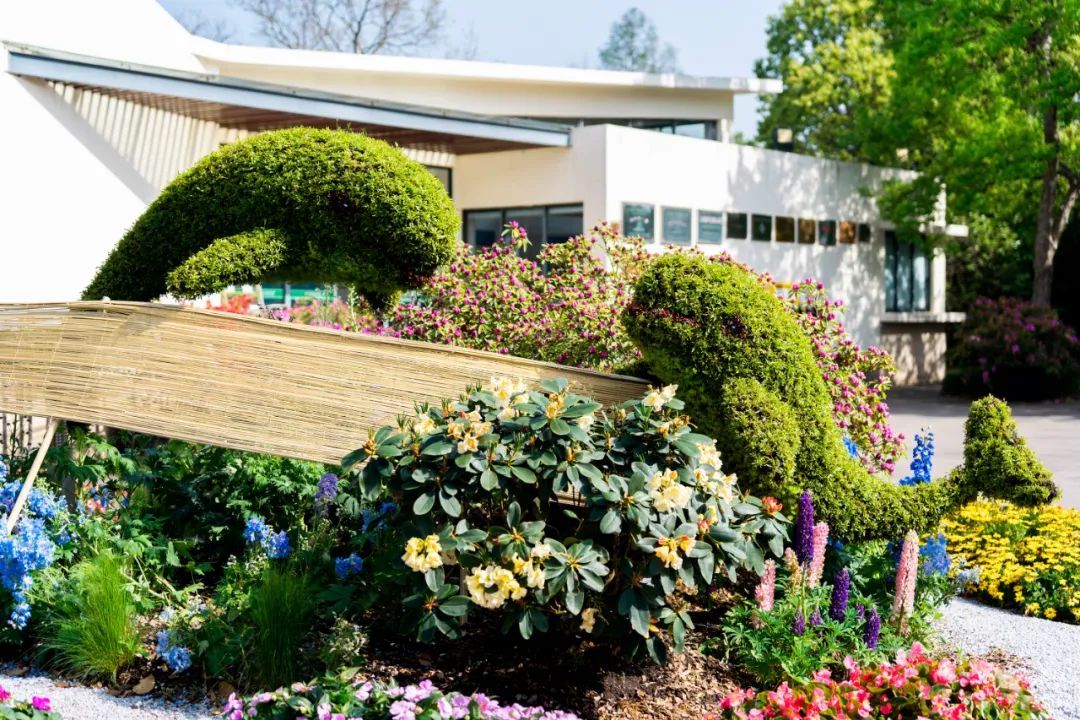 当春的脚步来临,万木争荣,繁花似锦。展点正对公园主入口,通过代表公园良好森林环境的“树木” 装置形成入口对景景观,采用高山杜鹃、大花飞燕草作为主要花材,奏响杜鹃花展的观花序曲。林下杜鹃花摇曳生姿,林中獐子驻足,林梢鸟儿鸣唱,一片欣欣向荣之景,寄托对万事万物美好祝愿之情。
