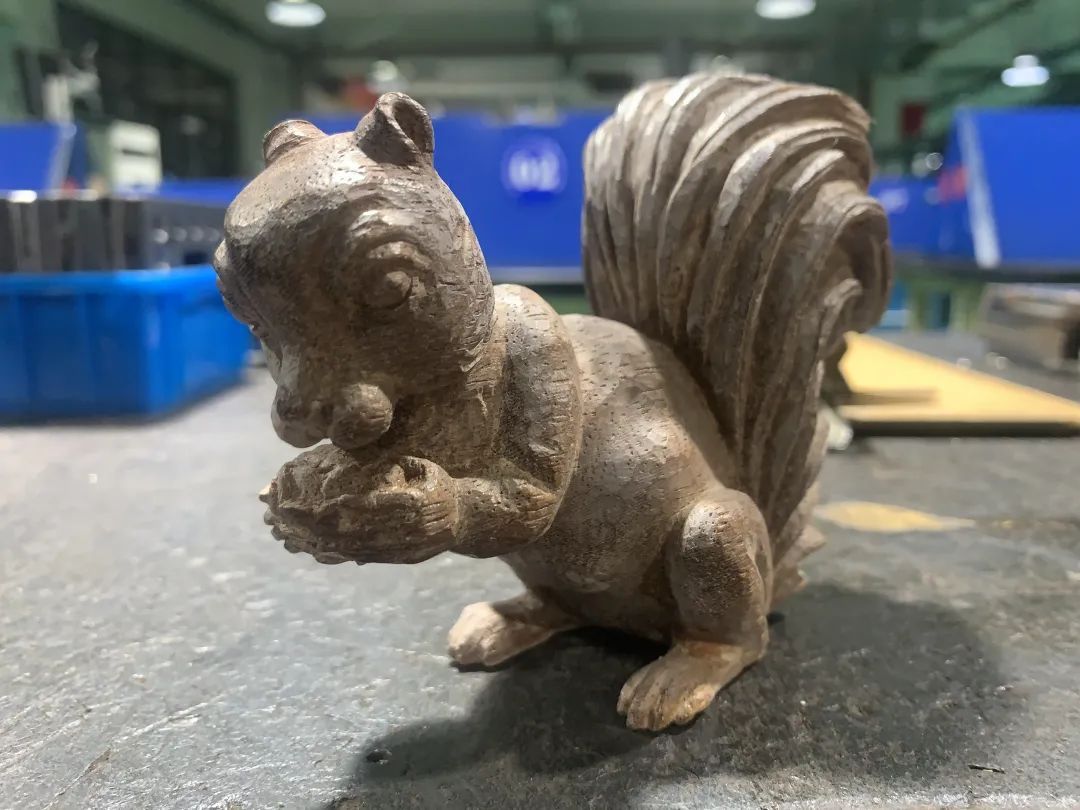 一锤一凿,一凿一挑,不到五分钟就勾勒出了一只松鼠的大致轮廓。站在一旁学习的学校黄杨木雕社团社长屠欣然告诉记者,陈老师以前说凿子和木料呈47度是最佳角度,不会伤害到刀具。