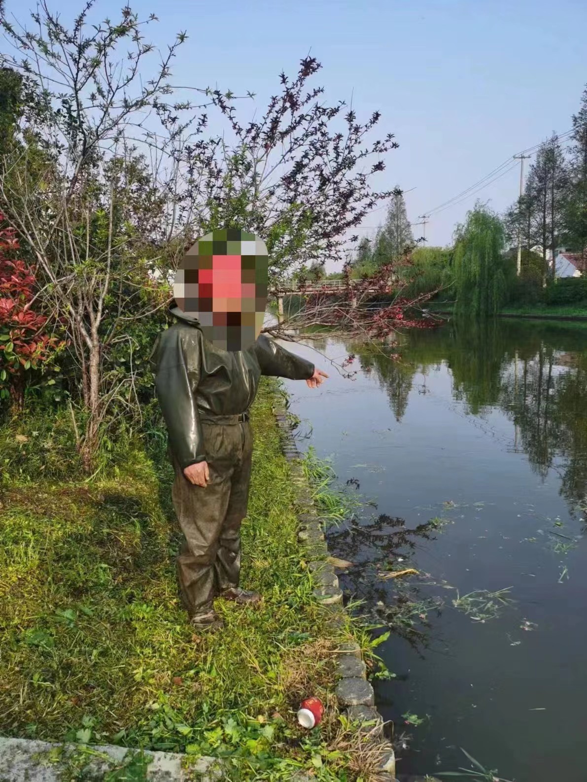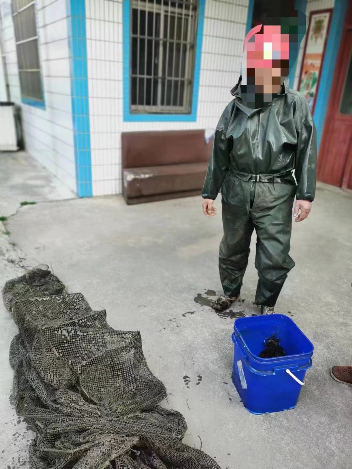 4月16日早上,上海市公安局崇明分局新村派出所民警王唯在辖区卫付路沿河道巡逻时,看见河道内有一人影,走近后见一男子穿着雨衣雨裤站在水中,一手拎塑料桶,一手正在起地笼,面部神情慌张。民警立刻明白该男子正在非法捕鱼,当即责令其收好地笼上岸。