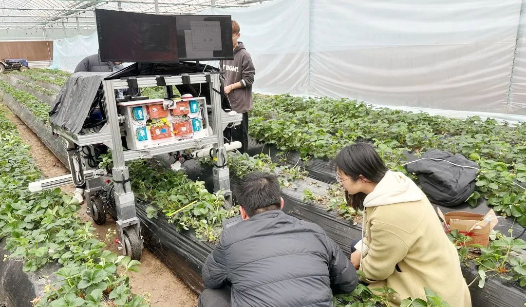 试验基地内,配置双机械臂的草莓采摘机器人在技术人员操作下,有序摘下田垄两侧的草莓,稳稳放入收集箱中。该机器人采用视觉技术识别、定位生熟草莓和采摘点,最快仅需4-5秒即可完成无损伤采摘,并能够准确实现跨垄、行走、自动换行等功能。
