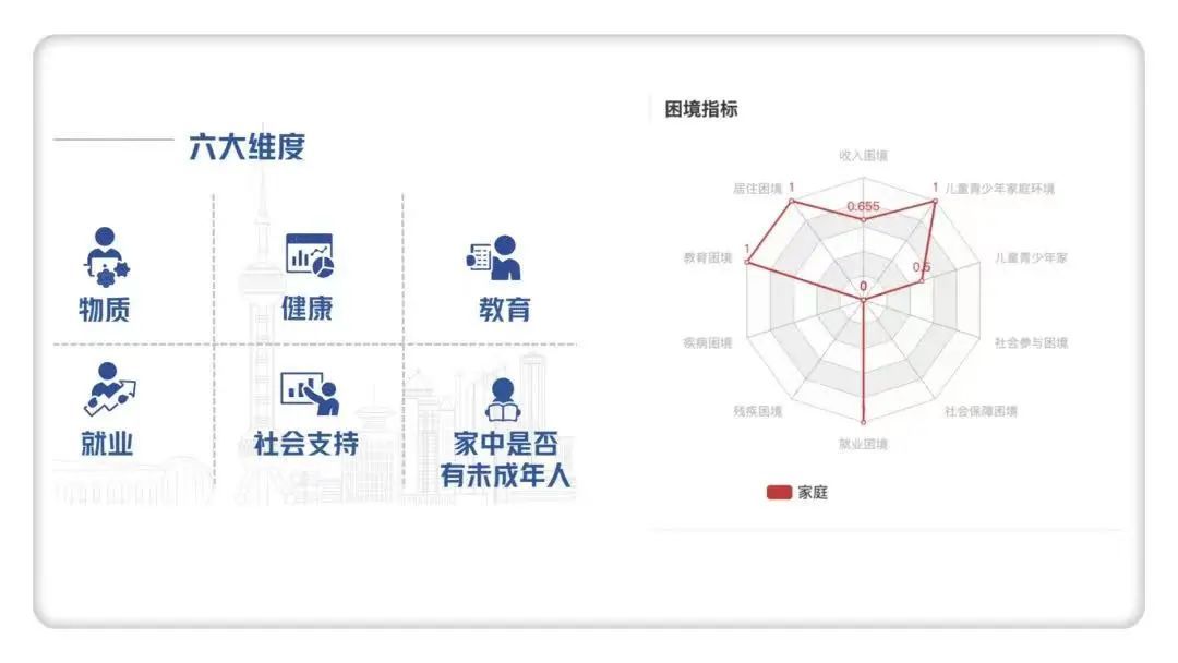 构建多维贫困指数。锁定重点服务人群,兼顾贫困发生率和贫困程度,在街镇、社区层面建立多维贫困指数,全面反映“区域贫困差异”,更客观、更精准地找到家庭及个人致贫致困的根本原因,明确救助帮扶重点。