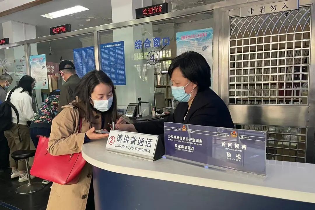 “阿婆,这个业务我们线上就能办理,不用拿号排队啦。”四平路派出所综合窗口大厅内,首问接待引导员正在指导朱老伯夫妇线上申请开具亲属关系证明。因老人亲属的户口不在四平地区,原本需前往老人与亲属曾经同户的户籍地派出所才能办理,但现在通过“一网通办”即可在线开具。
