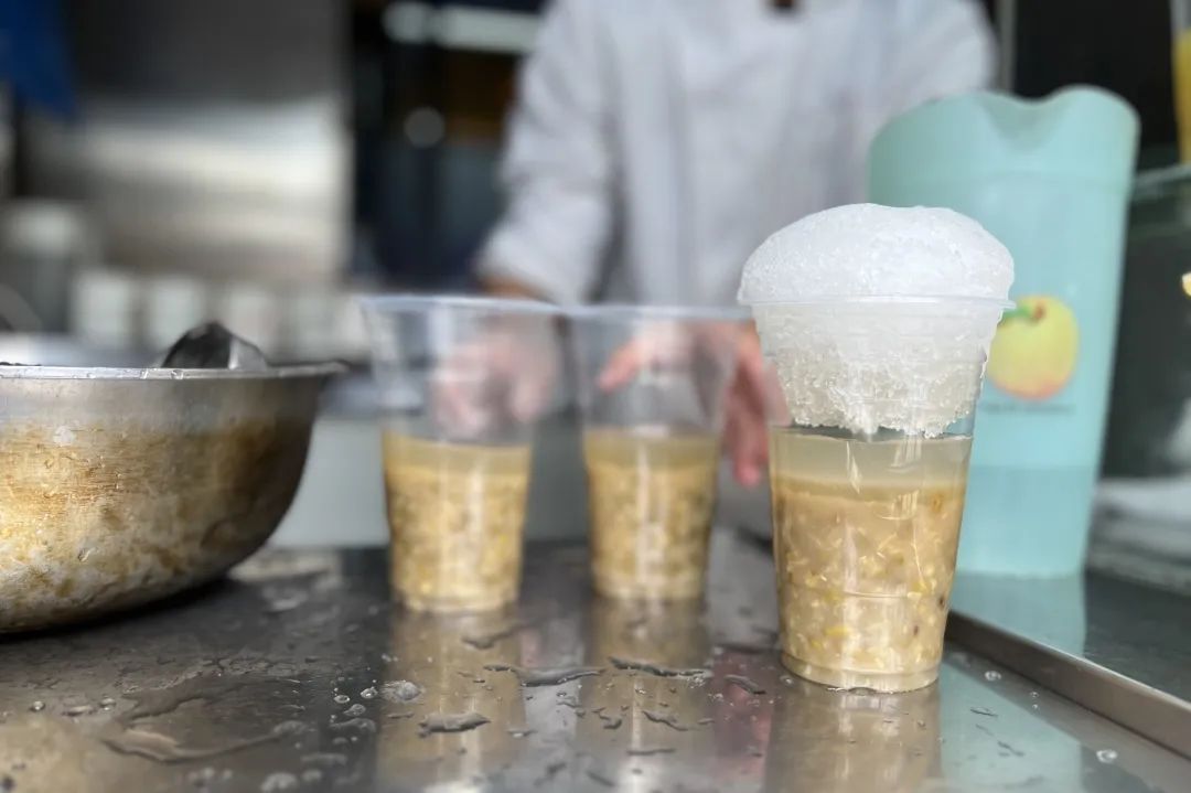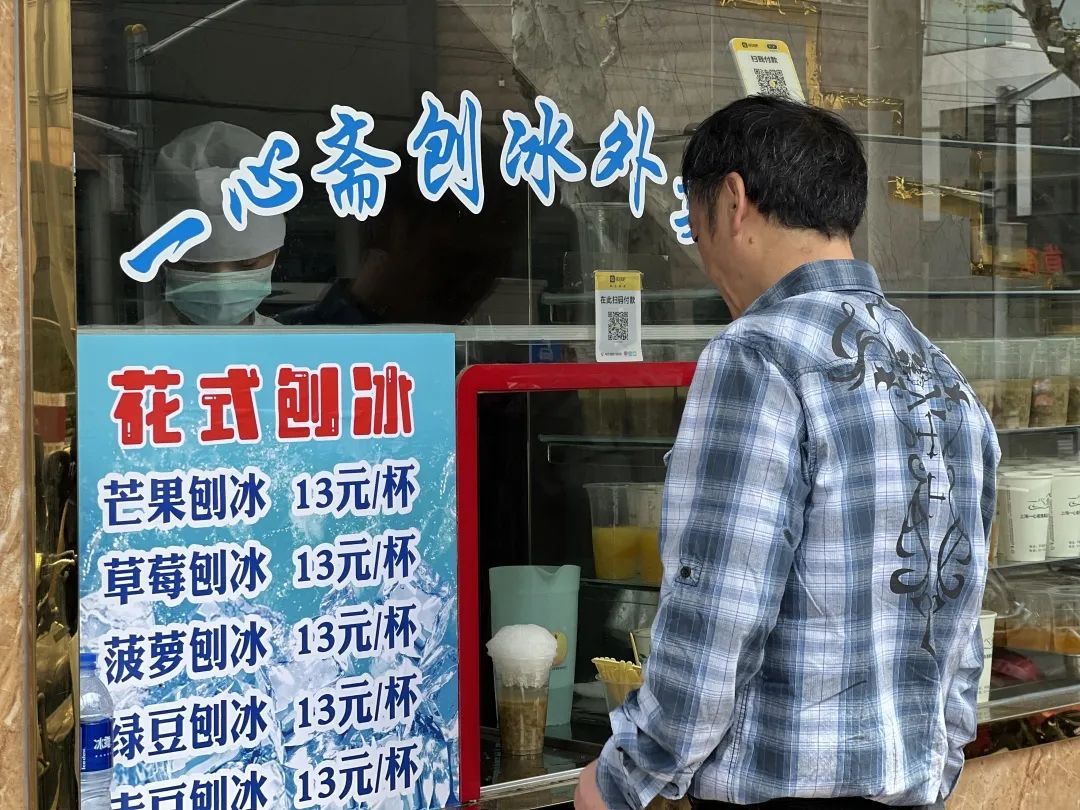 连日来气温攀升,刨冰早已成了食客们的宠儿。来上海旅游的陈女士没想到天气闷热,她忍不住来买了一杯绿豆刨冰。“我住在附近酒店,看到一心斋评价挺好就来吃吃看。”陈女士说,“味道确实不错,甜甜凉凉的,适合这个天气。”