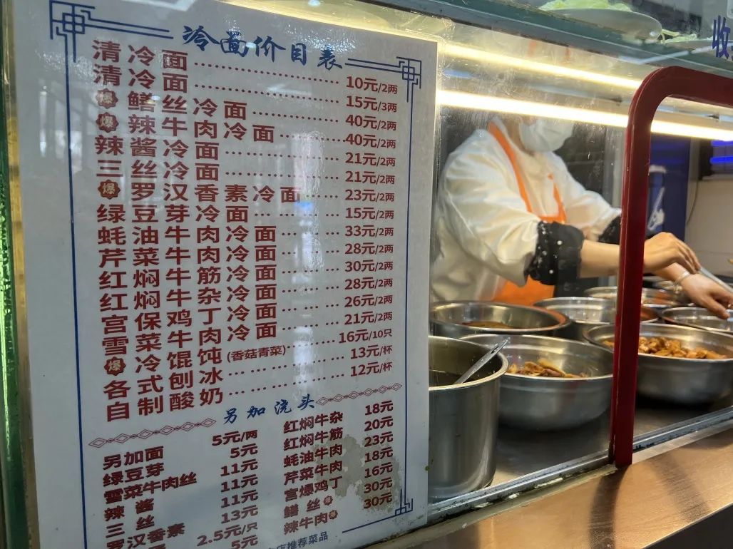 要问刨冰的黄金搭档是什么?自然是冷面。酱油一勺、醋一勺、花生酱一勺,再加少许辣油,这是冷面的标准调味。至于冷面的浇头,那可有不少选择,金灿灿、油亮亮的宫保鸡丁,清口解腻的炒三丝、雪菜肉丝,或是重口味一些的辣三丁,满满一勺淋在面上,立马有滋有味。不少食客坐在店内,一口面条,一口刨冰,仿佛已成为一种生活习惯。