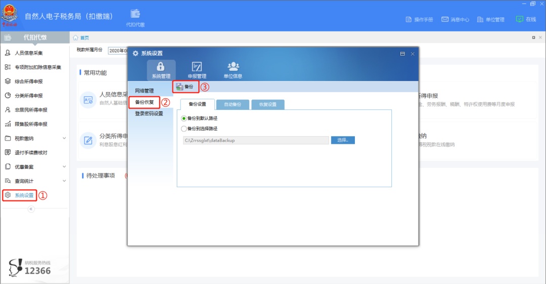 可以在原先用于申报的电脑上登录自然人电子税务局(扣缴端)将申报数据进行备份,具体路径为【系统设置】-【系统管理】-【备份恢复】-【备份设置】-【备份】。