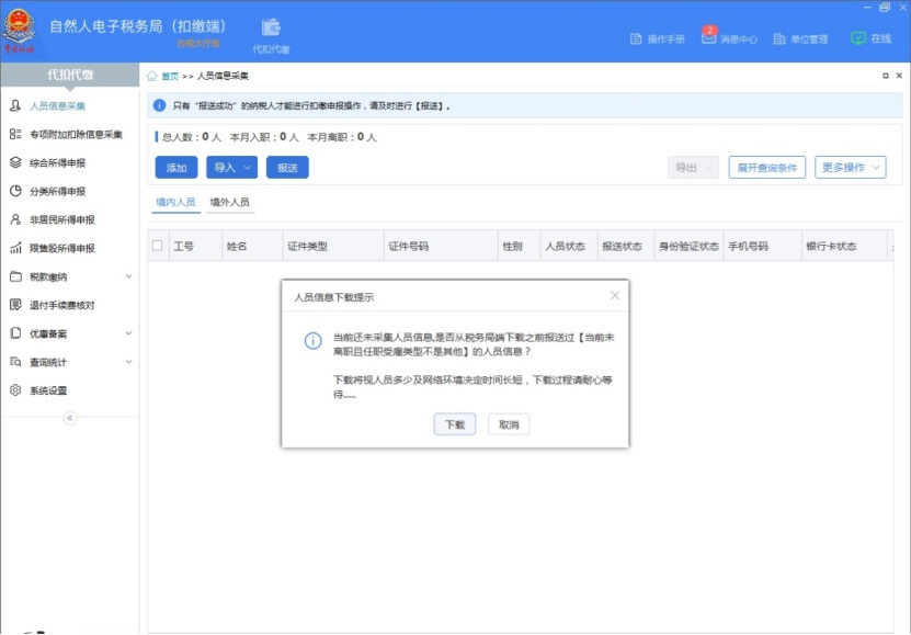 ③系统弹出“当前还未采集人员信息,是否从税务局端下载之前报送过【当前未离职且任职受雇类型不是其他】的人员信息?”对话框,点击下载