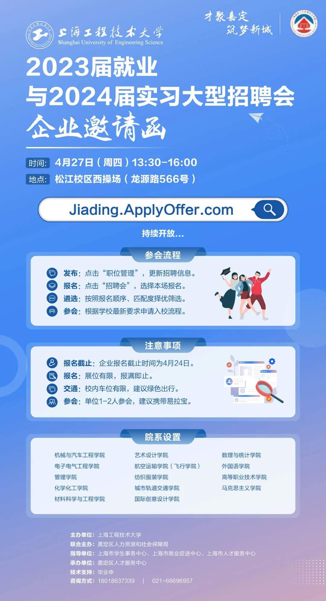 4月27日,上海工程技术大学2023届就业与2024届实习大型招聘会即将举行,诚邀嘉定区的单位参会。