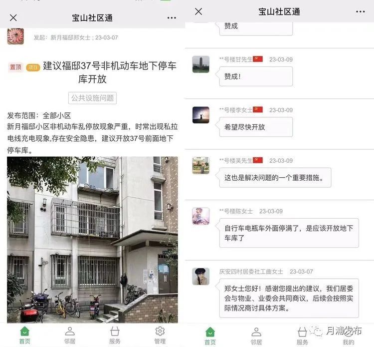 有居民在社区通平台“议事厅”板块创建议题,提议重新开放非机动车地下车库,此消息一经发布,大家纷纷留言表示赞成。