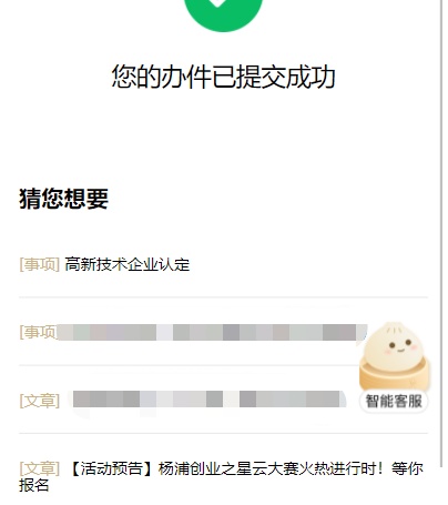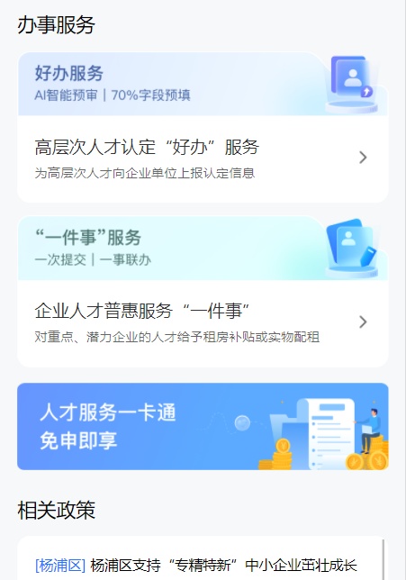 3)事后为企业推送“杨浦人才服务一卡通”等8类免申即享服务、“企业人才普惠服务一件事”及后置关联政策、资讯等,实现人才服务精准推送。