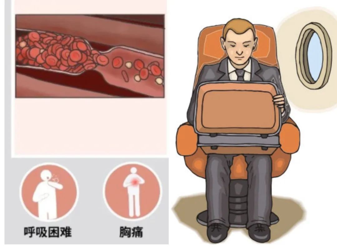 大家熟知的经济舱综合征就属于此类:经济舱乘客长时间坐在狭小的座位上,腿部血液流通不畅,形成凝块,下飞机后随其血液而流动进入支持肺部或心脏的一些小血管时,引起大面积栓塞的疾病。