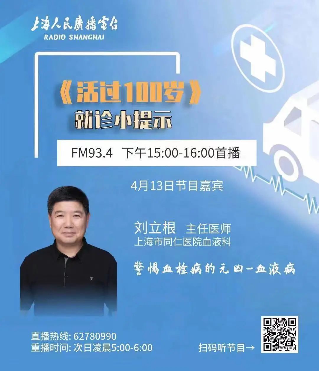 2023年4月13日15:00上海市同仁医院血液内科科室带头人刘立根主任做客上海人民广播电台《活过100岁》栏目,为广大听众朋友穿插许多经典案例、深入浅出地呈现一场主题为“警惕血栓病的元凶--血液病”的精彩科普讲座。