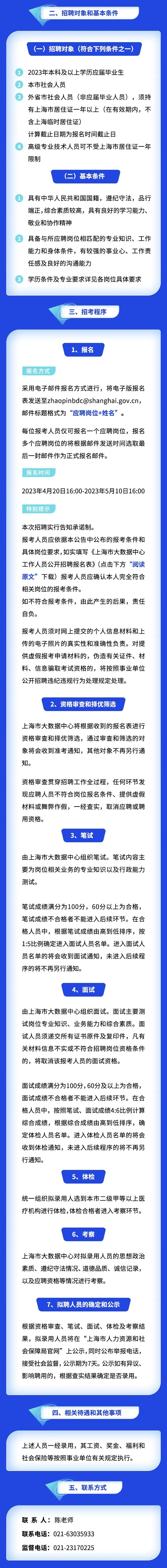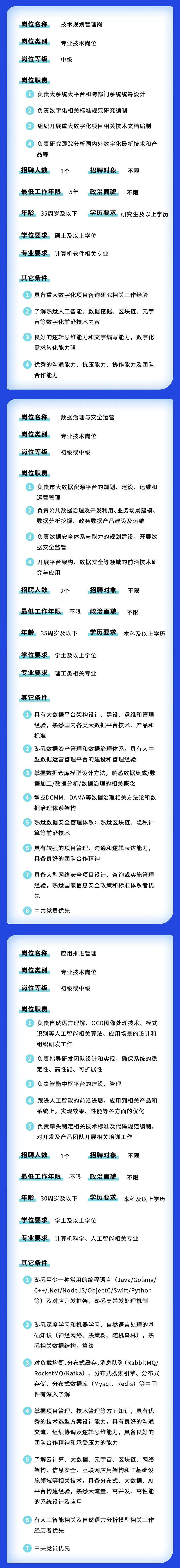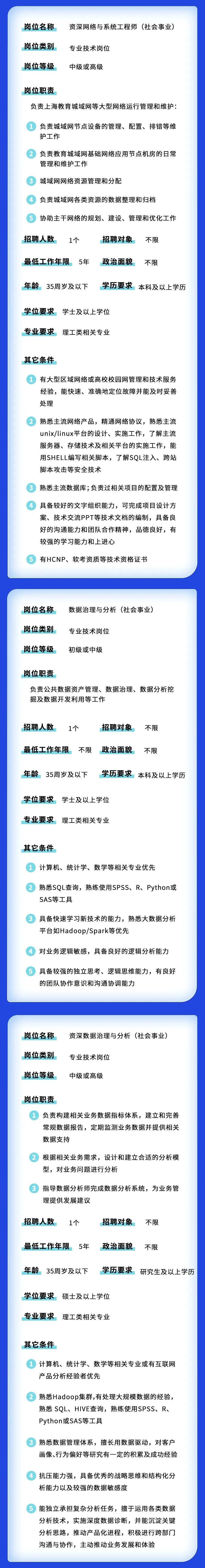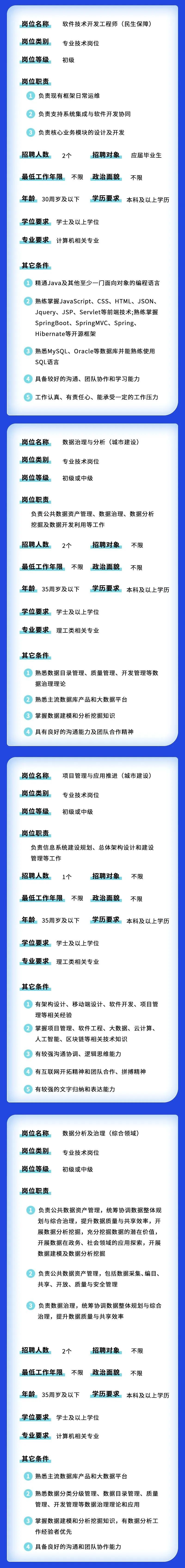市大数据中心公开招聘26名工作人员,涉及数据治理、项目工程师、软件技术开发工程师等岗位,报名采用电子邮件报名方式进行,有意向者可在5月10日16:00前将电子版报名表(点击文末“阅读原文”链接下载)发送至zhaopinbdc@shanghai.gov.cn,邮件标题格式为“应聘岗位+姓名”。详见↓